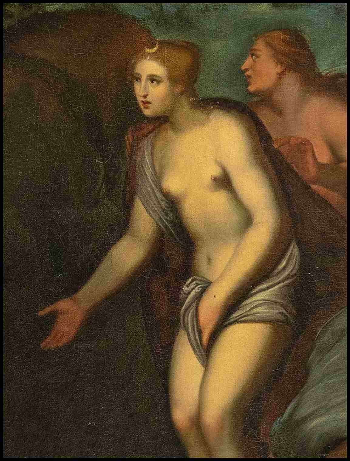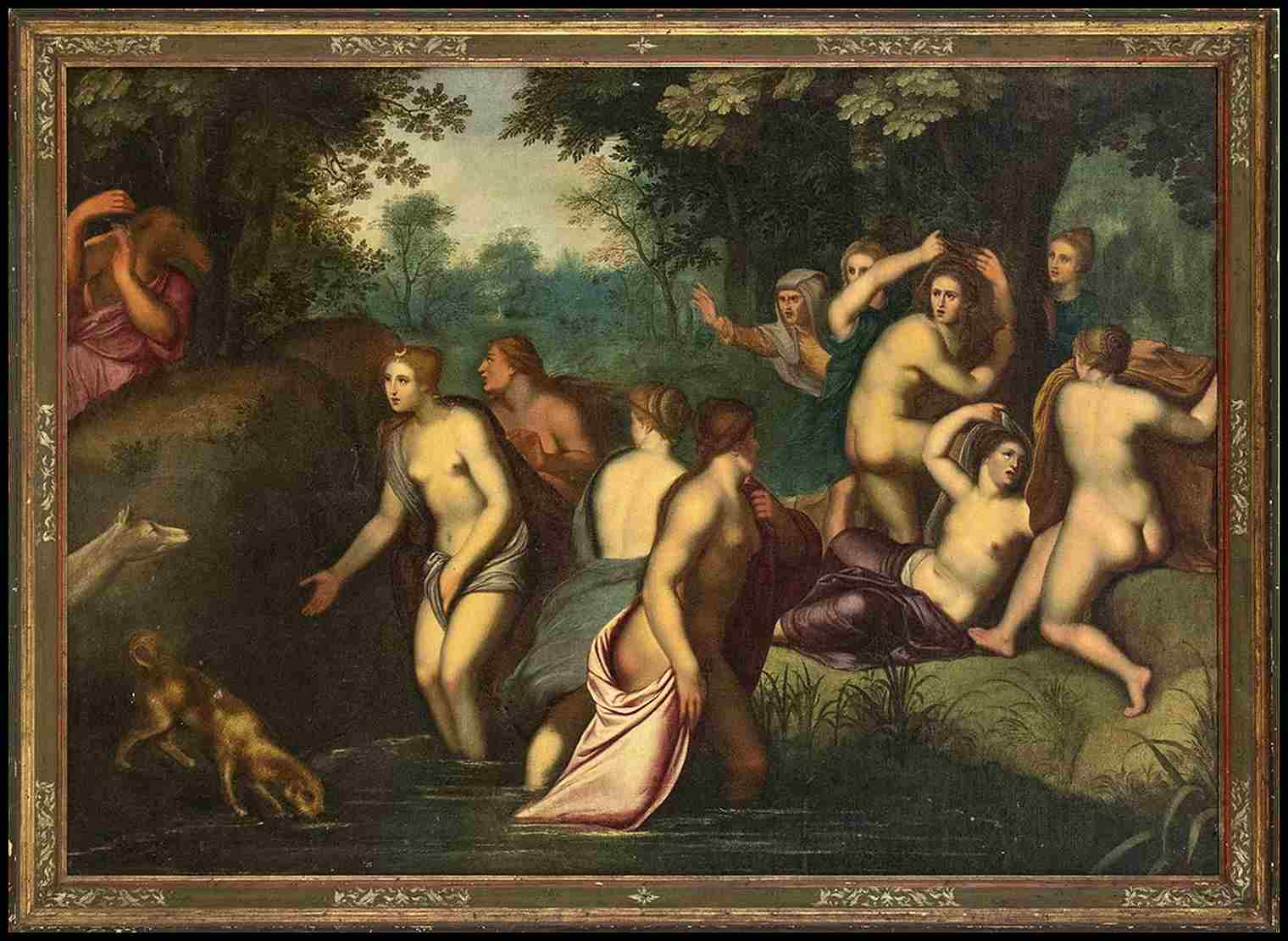 In questa plastica e movimentata raffigurazione del mito ovidiano di Diana e Atteone si rinviene una cultura figurativa complessa, facilmente riconducibile a quella congiuntura a cavallo tra XVI e XVII nota come "Manierismo di Haarlem". La nostra tela ne condivide, infatti i caratteri fondamentali: l'influsso della raffinata scuola che si sviluppò nella corte di Rodolfo II a Praga, e in particolare la potente suggestione dell'arte di Bartholomeus Spranger, l'influsso di Parmigianino, mutuato soprattutto per il tramite delle incisioni, e la pittura di Tiziano. Protagonisti della breve stagione della scuola di Haarlem furono Hebrickk Goltzius, Abraham Bloemaert, ma soprattutto Cornelis van Haarlem, la cui impronta risulta evidentissima nel nostro dipinto, con la sua energia, la sua composizione articolata, il suo accentuato grafismo combinato con morbidi impasti cromatici di marca veneziana. E' chiaramente riscontrabile qui l'adesione a un linguaggio pittorico che deriva da capolavori di Cornelis van Haarlem quali le Nozze di Peleo e Teti dell Frans Hals Museum di Haarlem o Venere, Bacco e Cerere della Gamäldegalerie di Dresda.