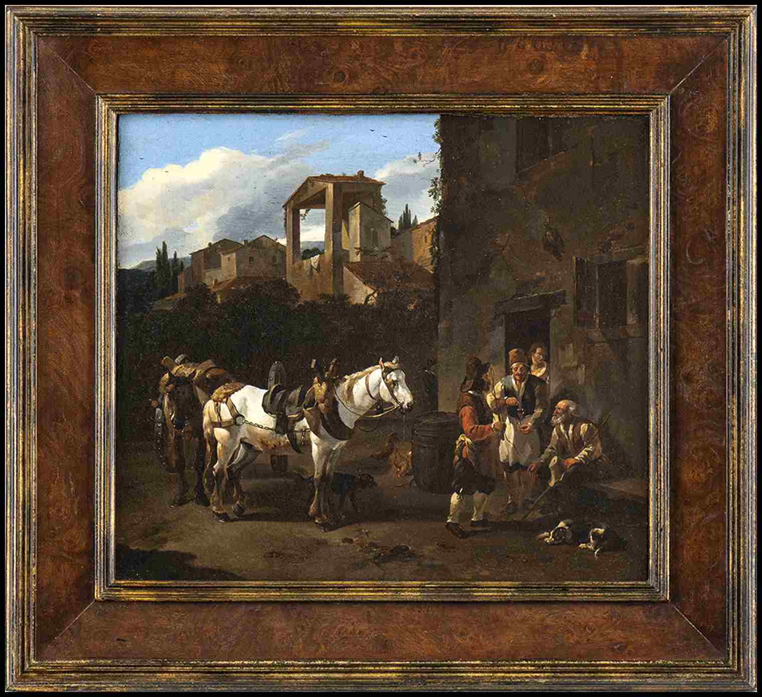 Questo notevole dipinto, autografo indiscutibile di Jan Miel, al di là alla sua qualità intrinseca riveste una non trascurabile importanza storica, che conferma sia la particolare riuscita della composizione, sia il notevole influsso esercitato da Miel fra gli artisti olandesi suoi contemporanei. Pochi anni dopo la sua esecuzione, infatti, il nostro dipinto fu copiato fedelmente da Nicolaesz Berchem in una tela firmata oggi presso la Gemäldegalerie di Berlino (n. 890). Inoltre nel XVIII secolo la tela di Jan Miel si trovava nella straordinaria collezione parigina di M. Poullain, in cui dominava la pittura dei Paesi Bassi. Disponiamo di questa preziosa informazione sulla storia collezionistica del dipinto poiché esso fu tradotto in controparte dall’incisore Pattas per l’album “Collection de cent-vingt estampes gravèes d’aprés les Tableaux et Dessins qui composoient les cabinet de M. Poullain”, edito a Parigi nel 1781.