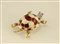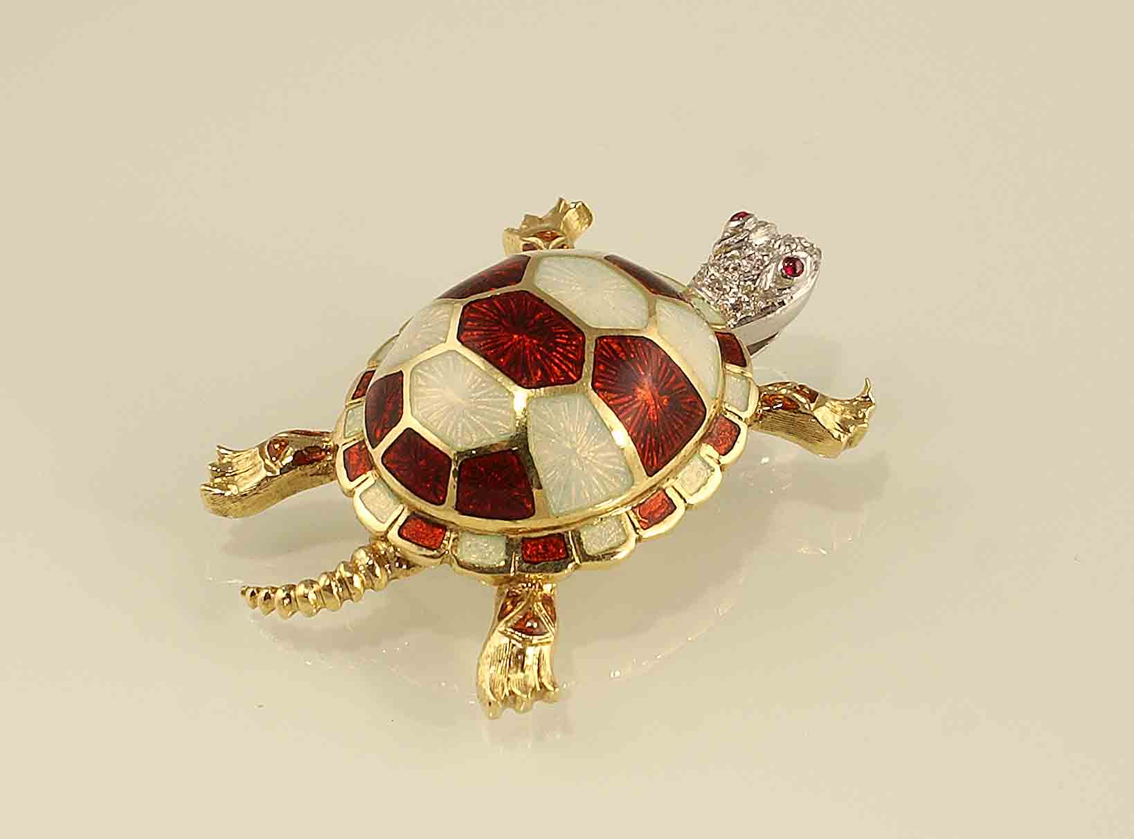 Spilla pendente a motivo di tartaruga in oro giallo 18kt con stesura di smalto policromo, con incastonati diamanti taglio brillante per 0,08 punti circa e occhi di rubini cabochon, gr. 14,7.