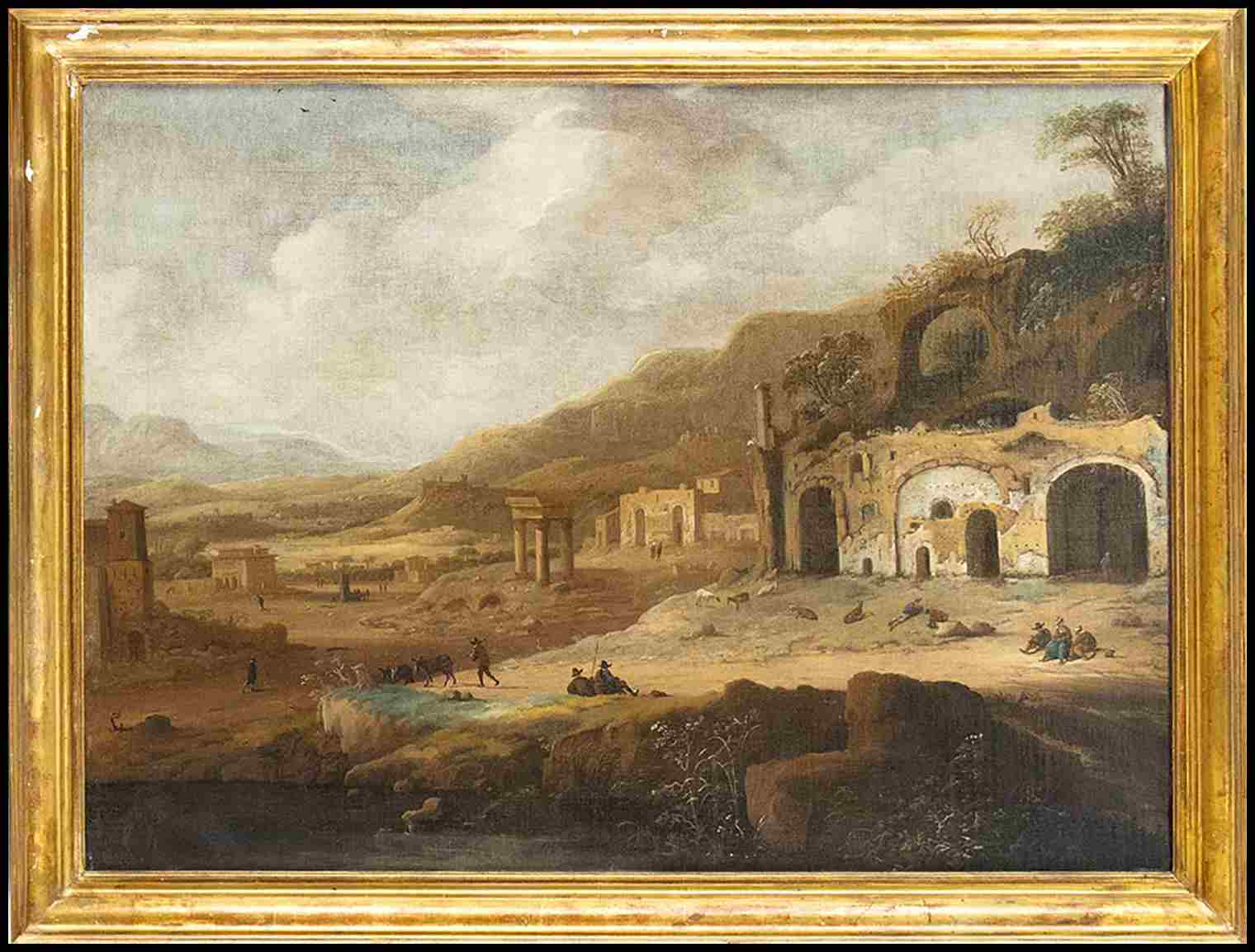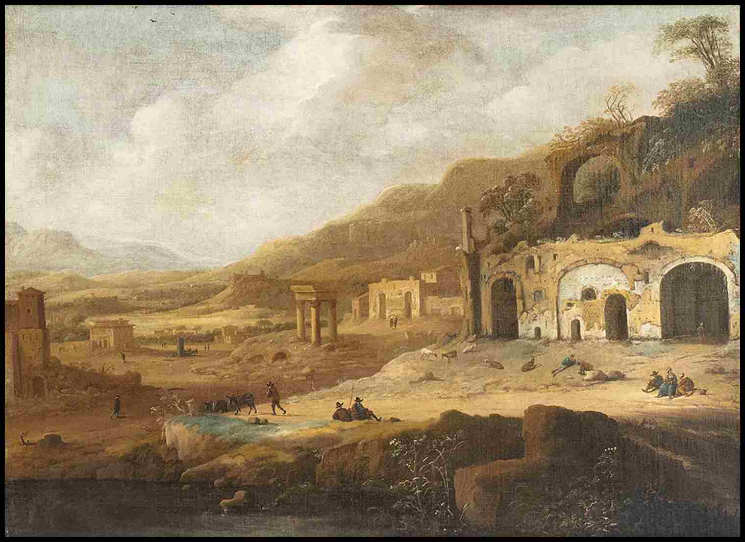 Questo bel Capriccio, rivela esaurientemente la fascinazione esercitata dalle rovine classiche, dalla luce e dalla natura mediterranea sui pittori di paesaggio che nel Seicento scendevano a Roma dalle Fiandre e dall'Olanda. Ammiriamo qui la luce tersa e omogeneamente diffusa che conferiva un'aura quasi mitica alle liriche visioni di Poelenborch, Asselyn, Du Jardin e Gottfried Wals (quest’ultimo anche per le filiformi figurette). Il calmo nitore della composizione si accorda con una visione estensiva del paesaggio, che si sviluppa a perdita d'occhio punteggiato di viandanti, pastori, contadini al riposo e ruderi classici.