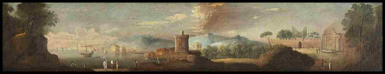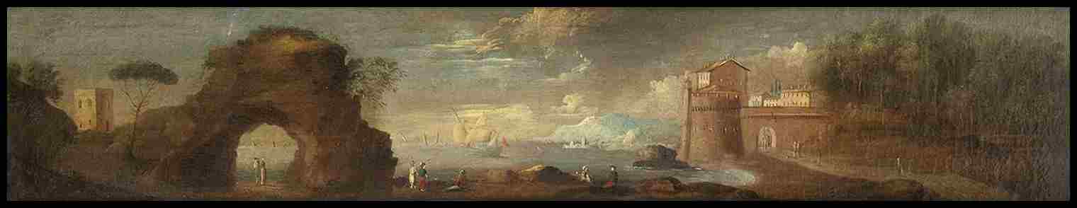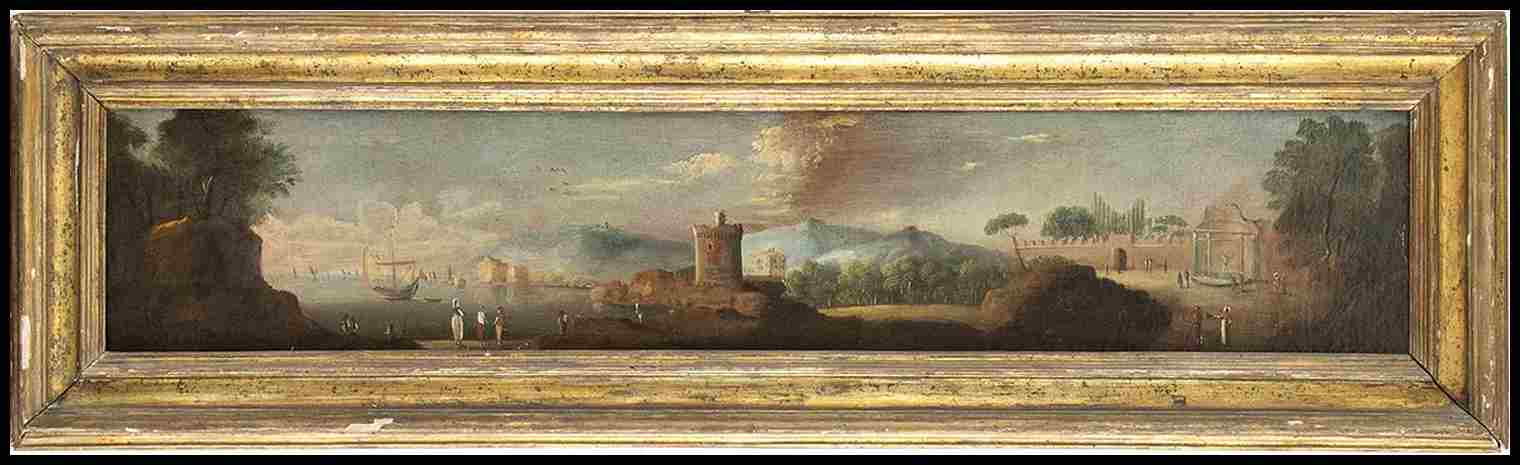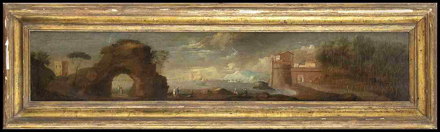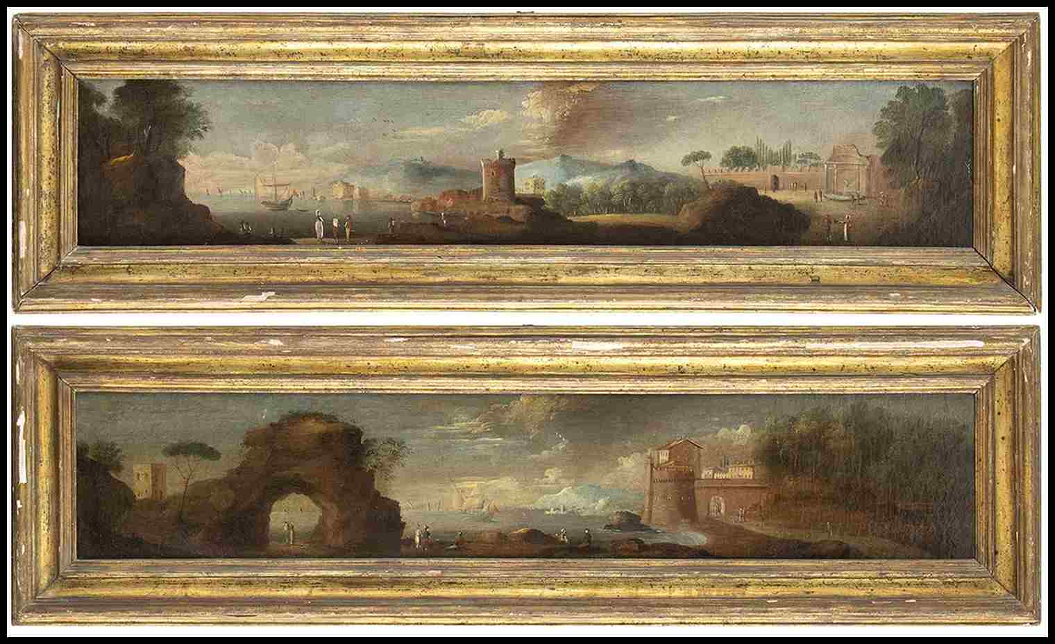 a) Veduta costiera con torrione, fortezza, figure e imbarcazioni; b) Veduta costiera con borgo fortificato, arco di roccia, figure e imbarcazioni. Coppia di dipinti
