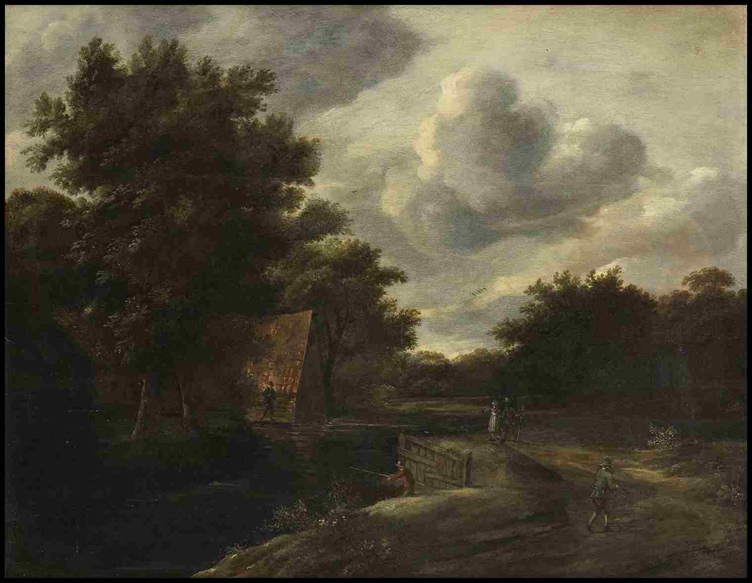 Paesaggio con corso d'acqua, pescatore e viandanti