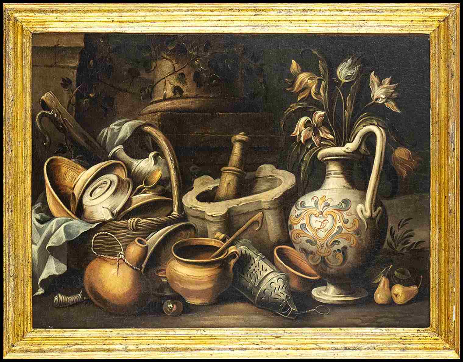 Natura morta con stoviglie, mortaio e vaso di fiori