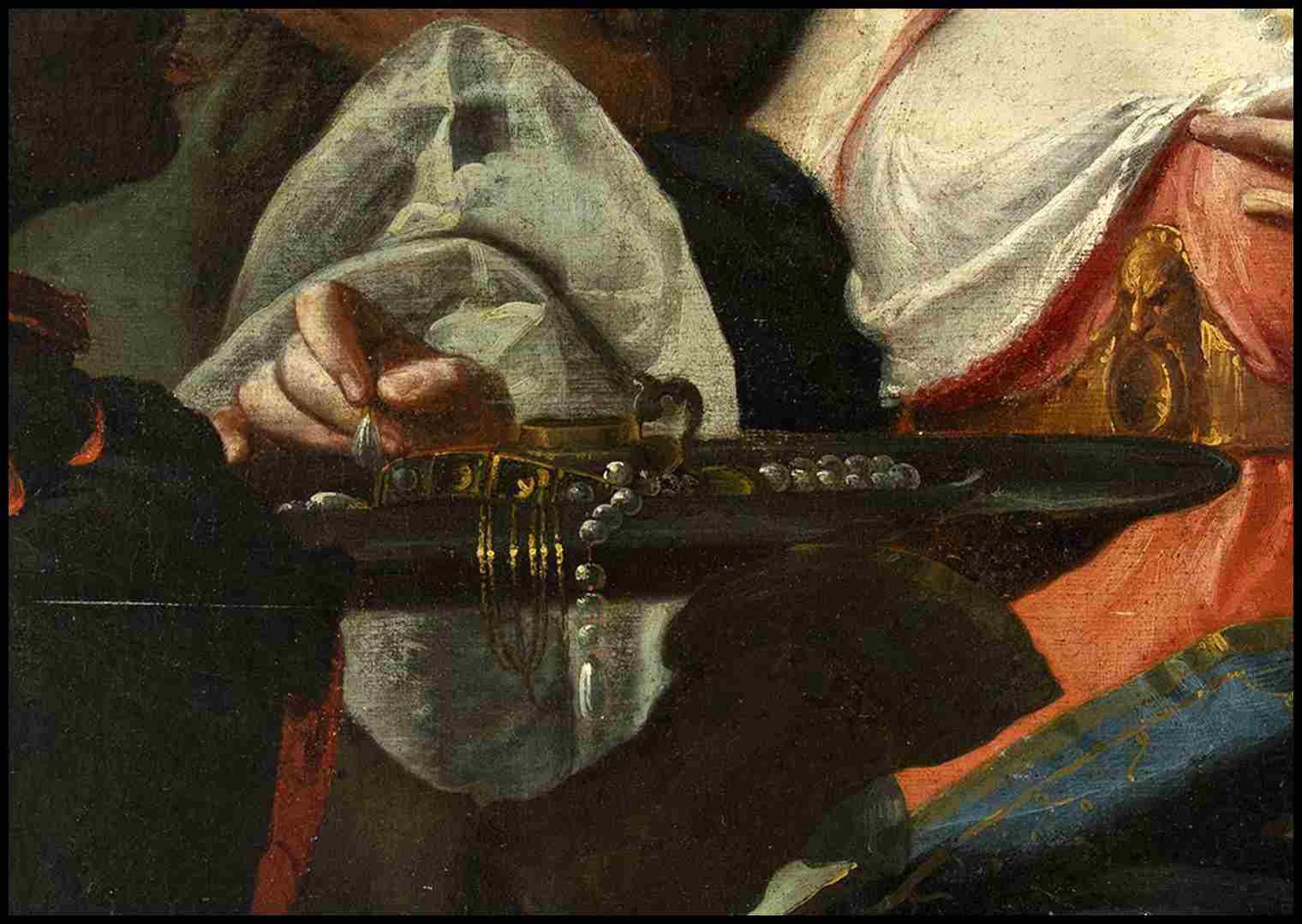 Questa mirabile tela, sontuosamente scenografica, esibisce senza possibili equivoci la sua appartenenza alla grande civiltà figurativa del Settecento veneziano. In particolare risulta evidente il modello della pittura di Giambattista Tiepolo, vera e inaggirabile pietra angolare per tutti gli artisti attivi in area veneta nella seconda metà del XVIII secolo. Non privo di ambiguità è il soggetto rappresentato, imperniato sulle tre figure che occupano la scena, la cui disposizione crea un effetto quasi vorticoso, accentuato dal formato ovale della tela. Nondimeno, la centralità ottica e narrativa rivestita dall’orecchino di perla che la nobildonna lussuosamente abbigliata prende con la mano destra dal vassoio sorretto dal giovane moro, come pure la tazza posta all’interno dello stesso vassoio, autorizzano, sia pur in via di ipotesi, un possibile riconoscimento della scena come Cleopatra che, durante un fastoso banchetto offerto ad Antonio nella sua reggia, scioglie una perla in una coppa di vino per dimostrare al generale romano la sua magnificenza e il suo sprezzo della ricchezza.