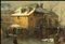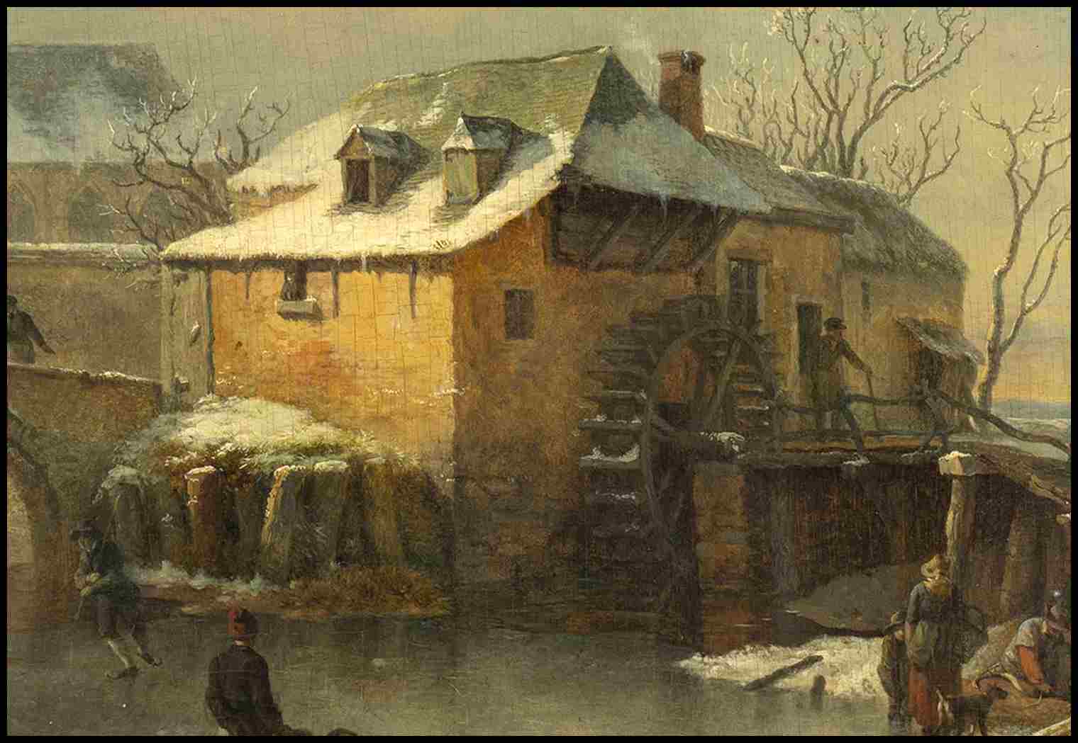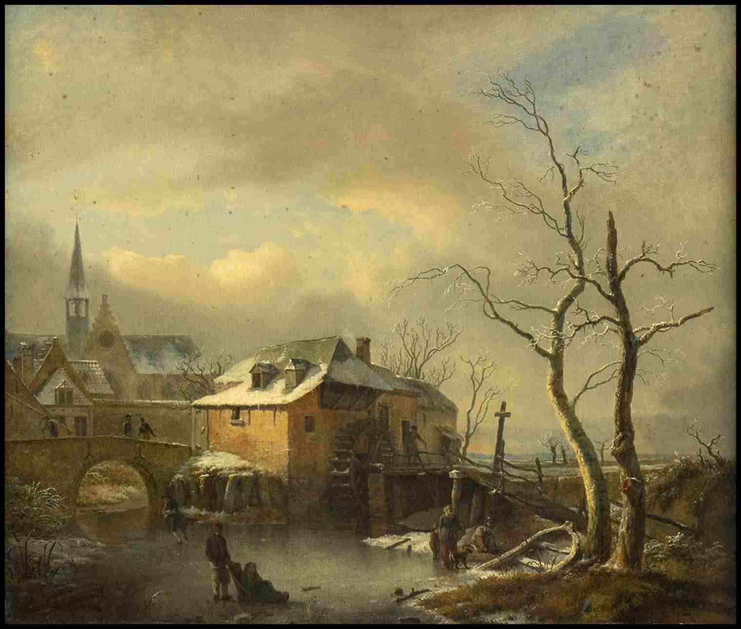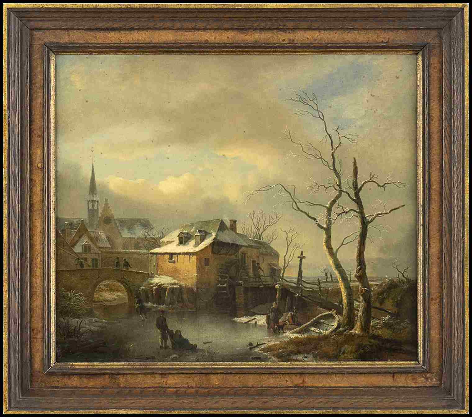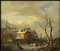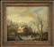 Paesaggio invernale con villaggio e figure sul lago ghiacchiato