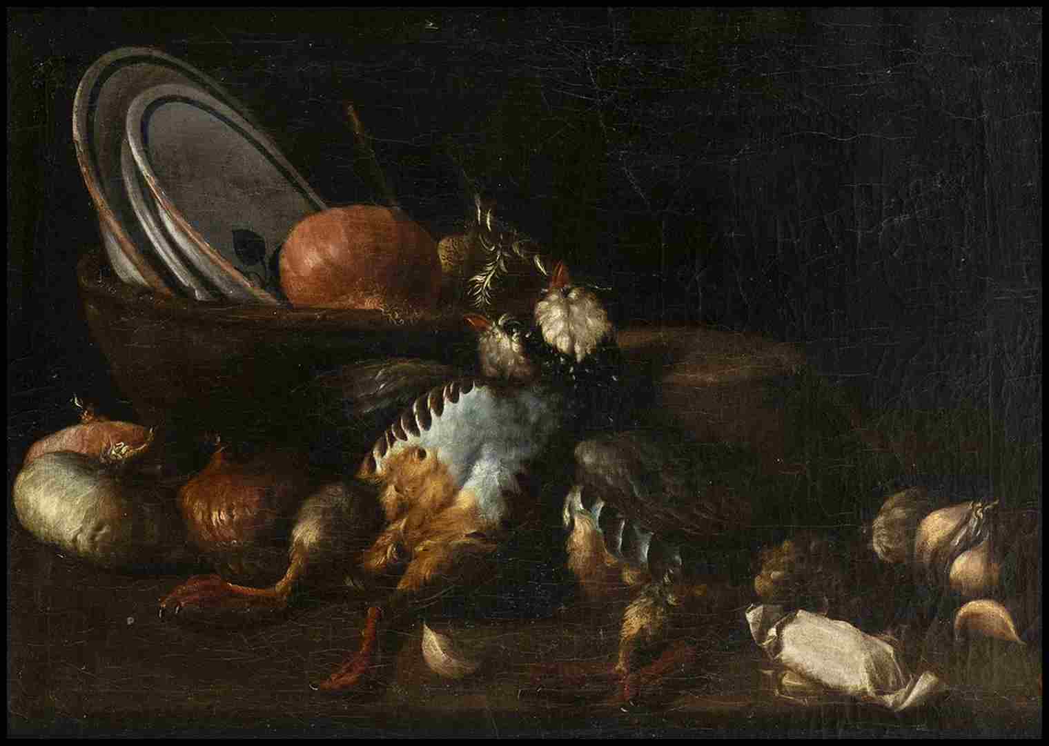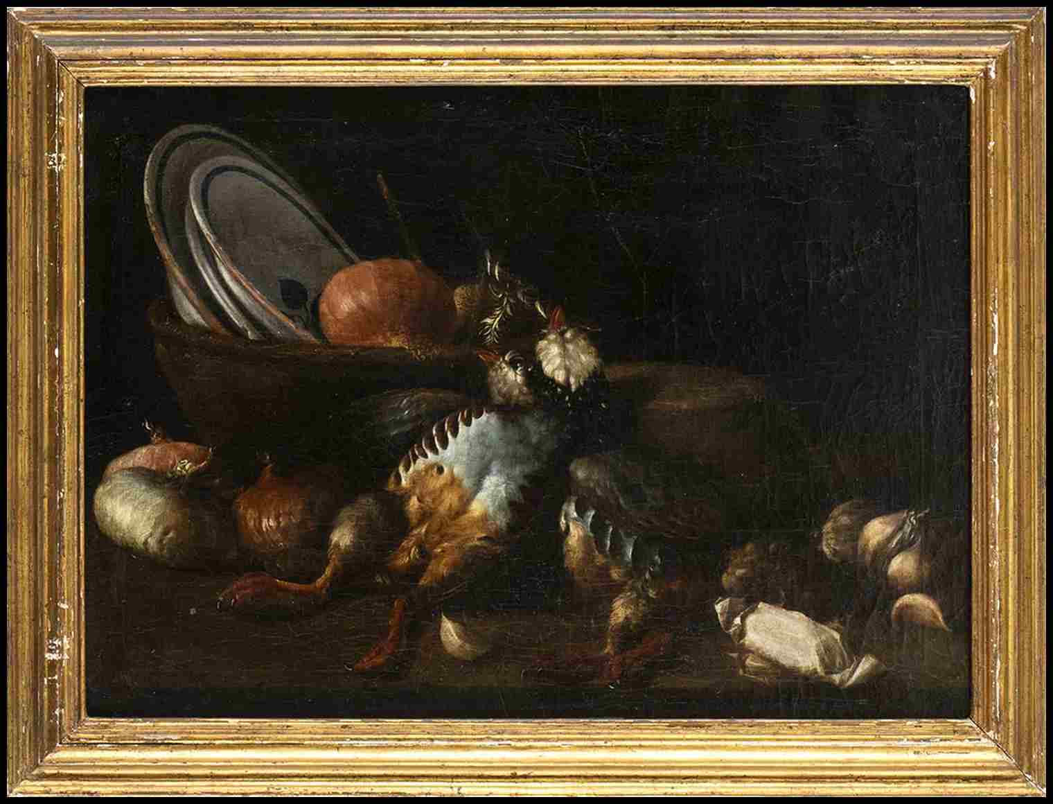 Natura morta di vasellame, cipolle e cacciaggione
