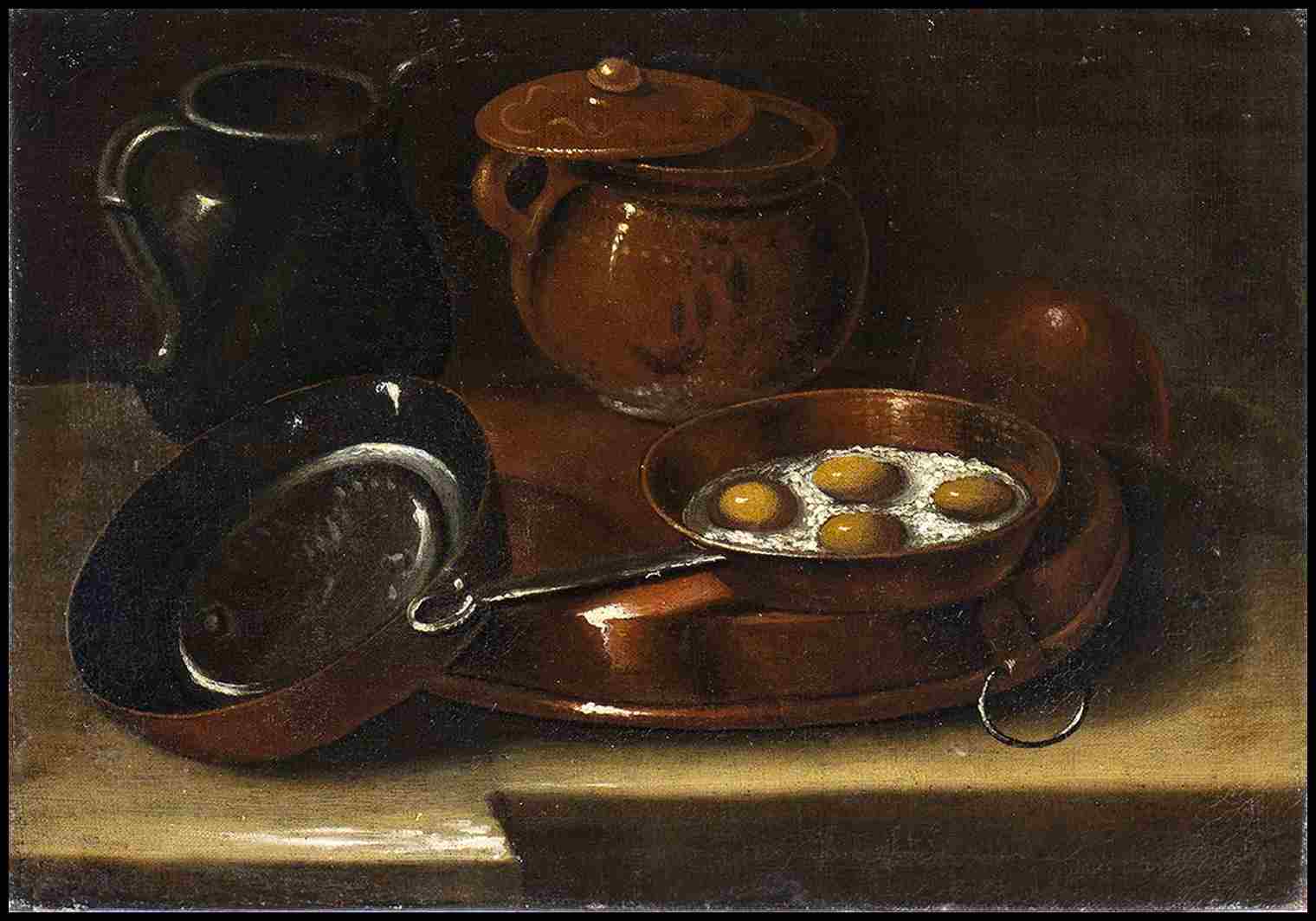 Natura morta con vasellame, pentole di rame e tegame con uova