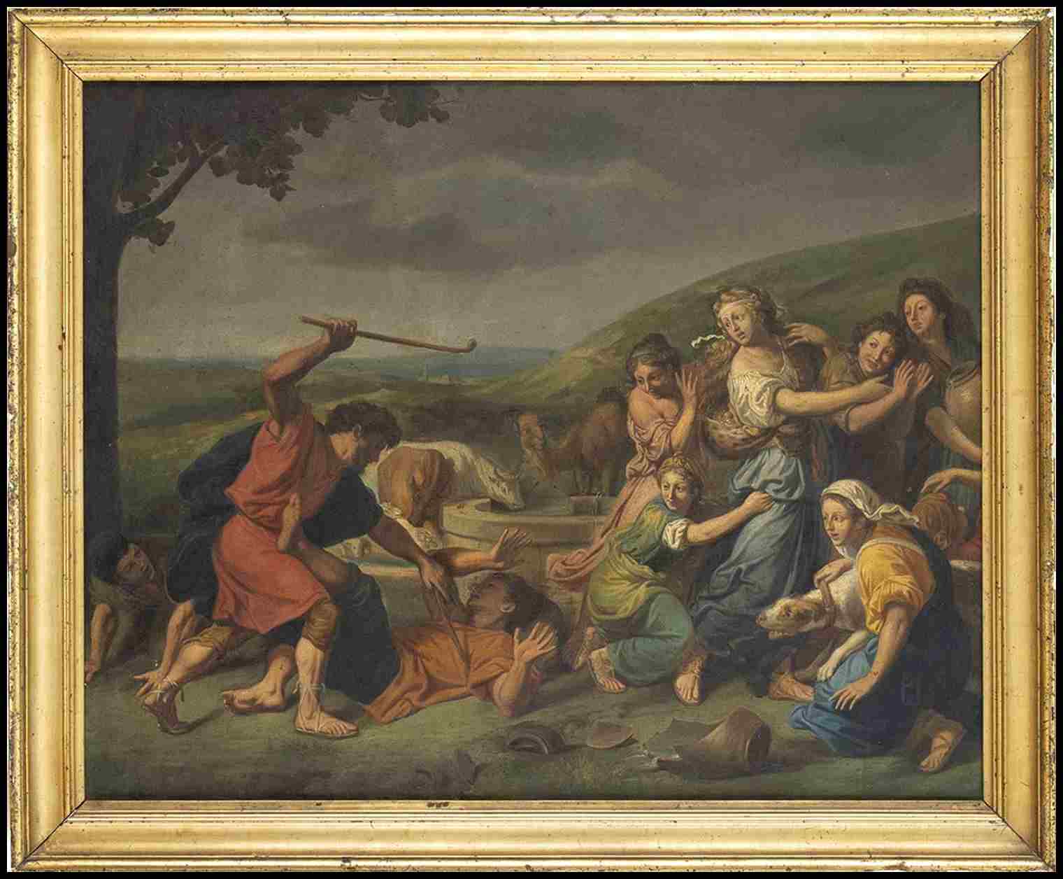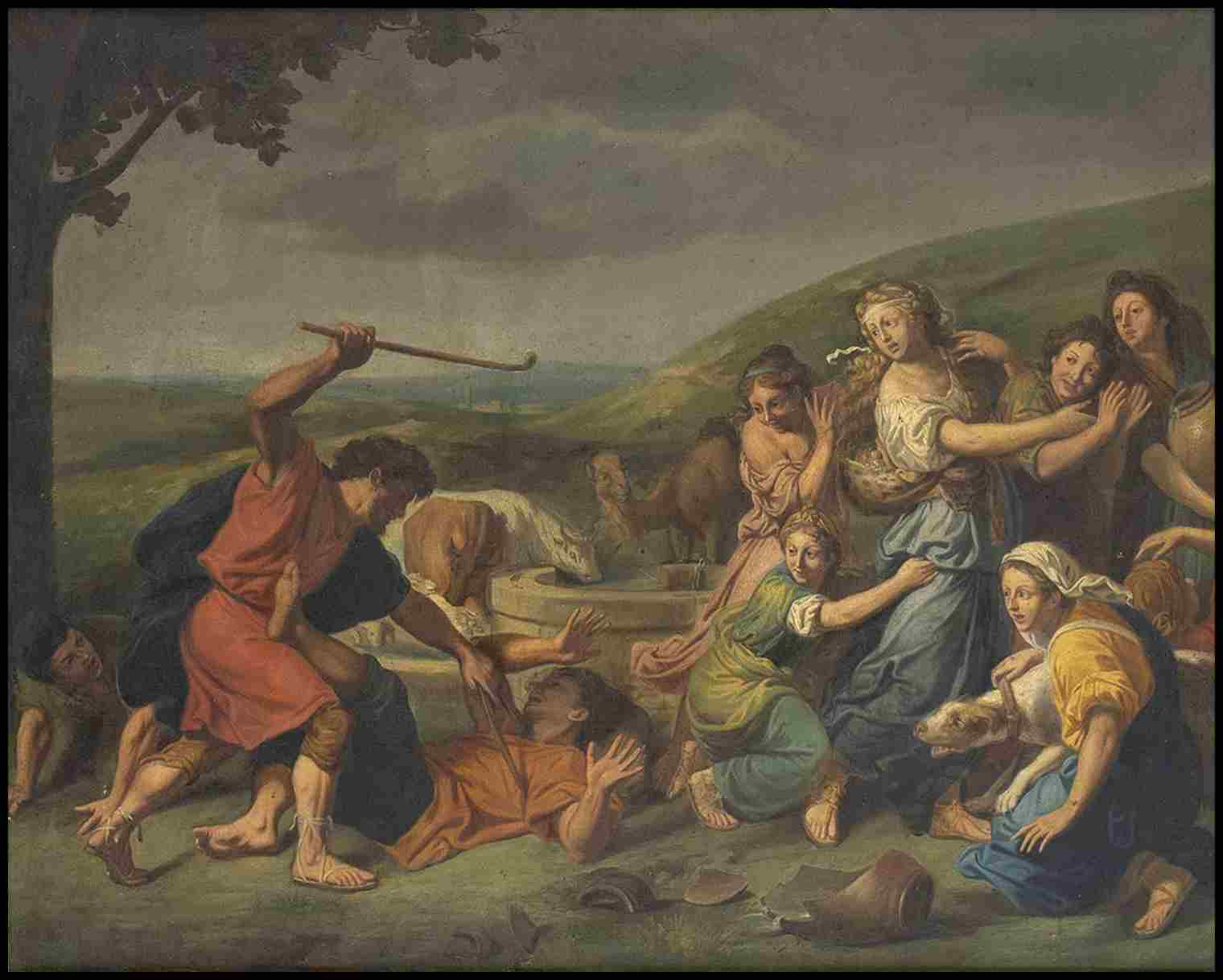 L'episodio raffigurato nella tela si trova così descritto nell'Antico Testamento dalle sette figlie di Jetro: "Un egiziano ci ha difeso dalla violenza dei pastori, ed inoltre ha attinto per noi ed abbeverato il gregge» (Esodo, 2, 19). Il nostro dipinto deriva dalla tela, in tutto analoga per soggetto e composizione, eseguita da Charles Le Brun per il Petit appartement du roi di Luigi XIV nella Reggia di Versailles.