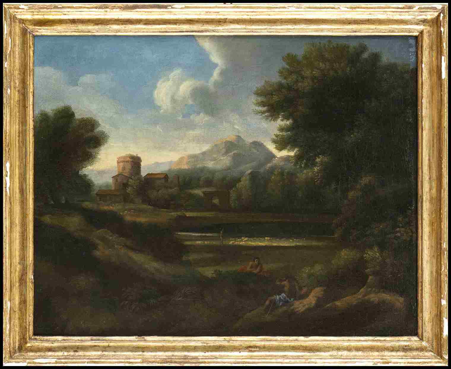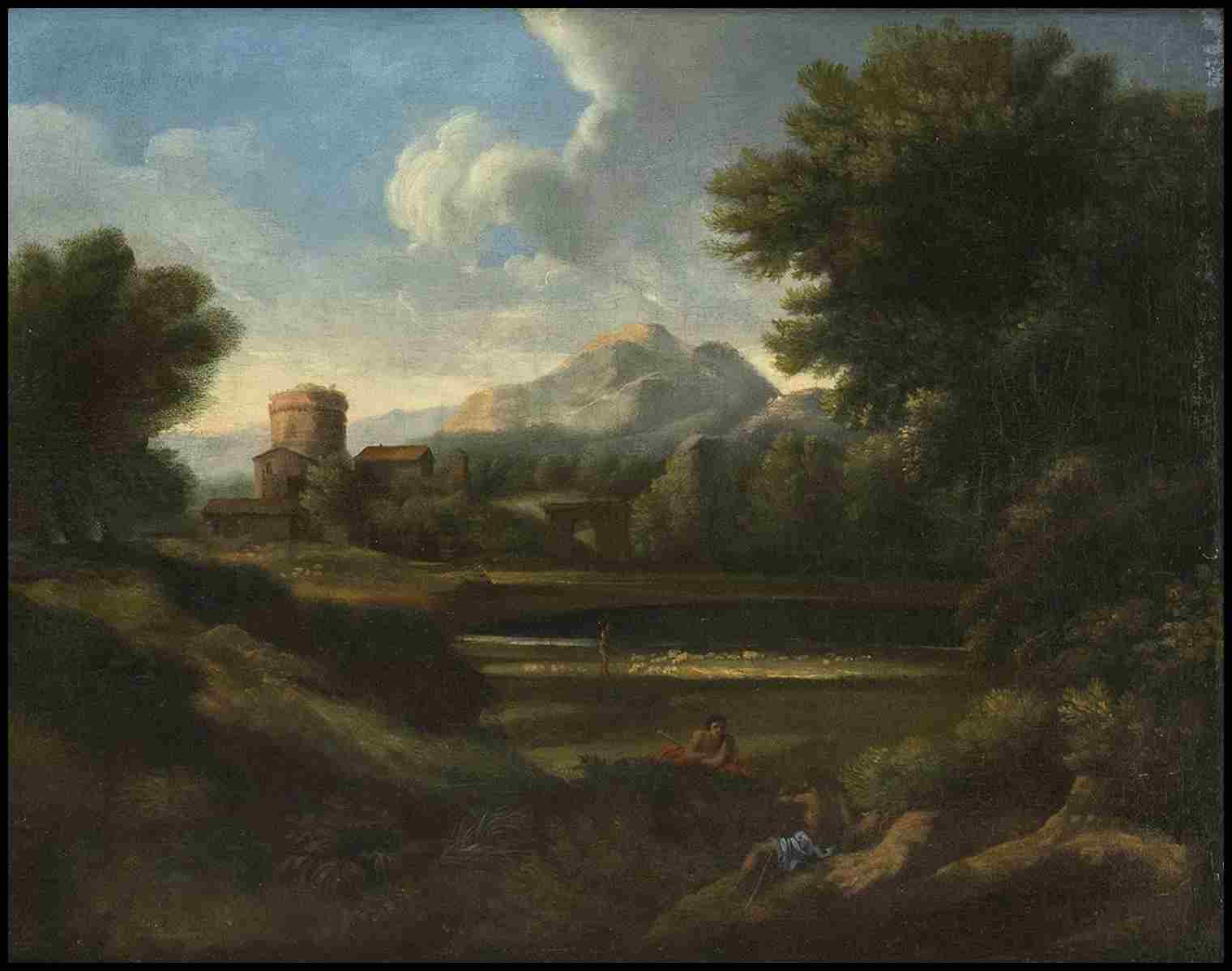 Paesaggio con pastori, gregge di pecore, arco e torrione sullo sfondo