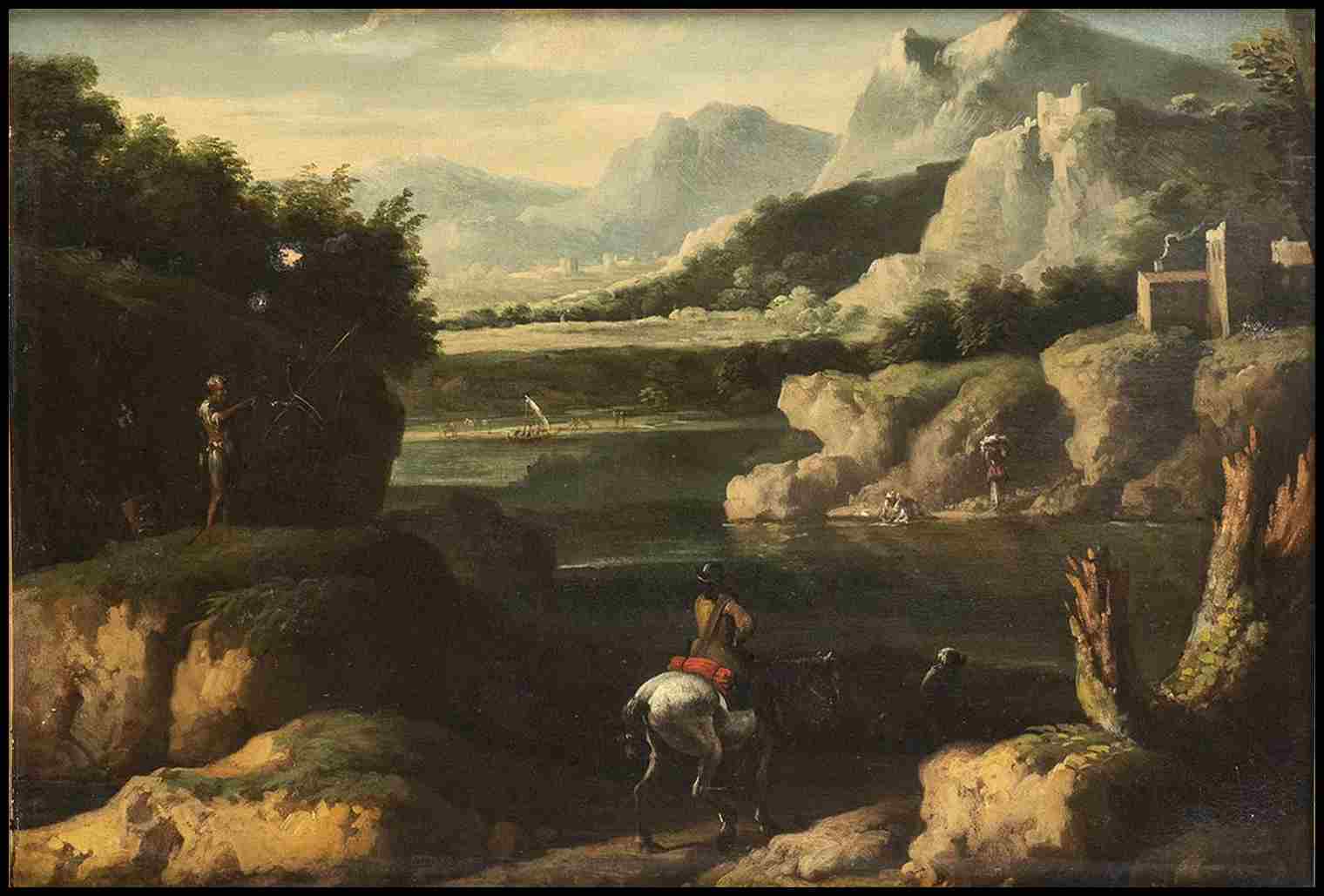 Paesaggio con specchio d'acqua, lavandaie e cavaliere in primo piano
