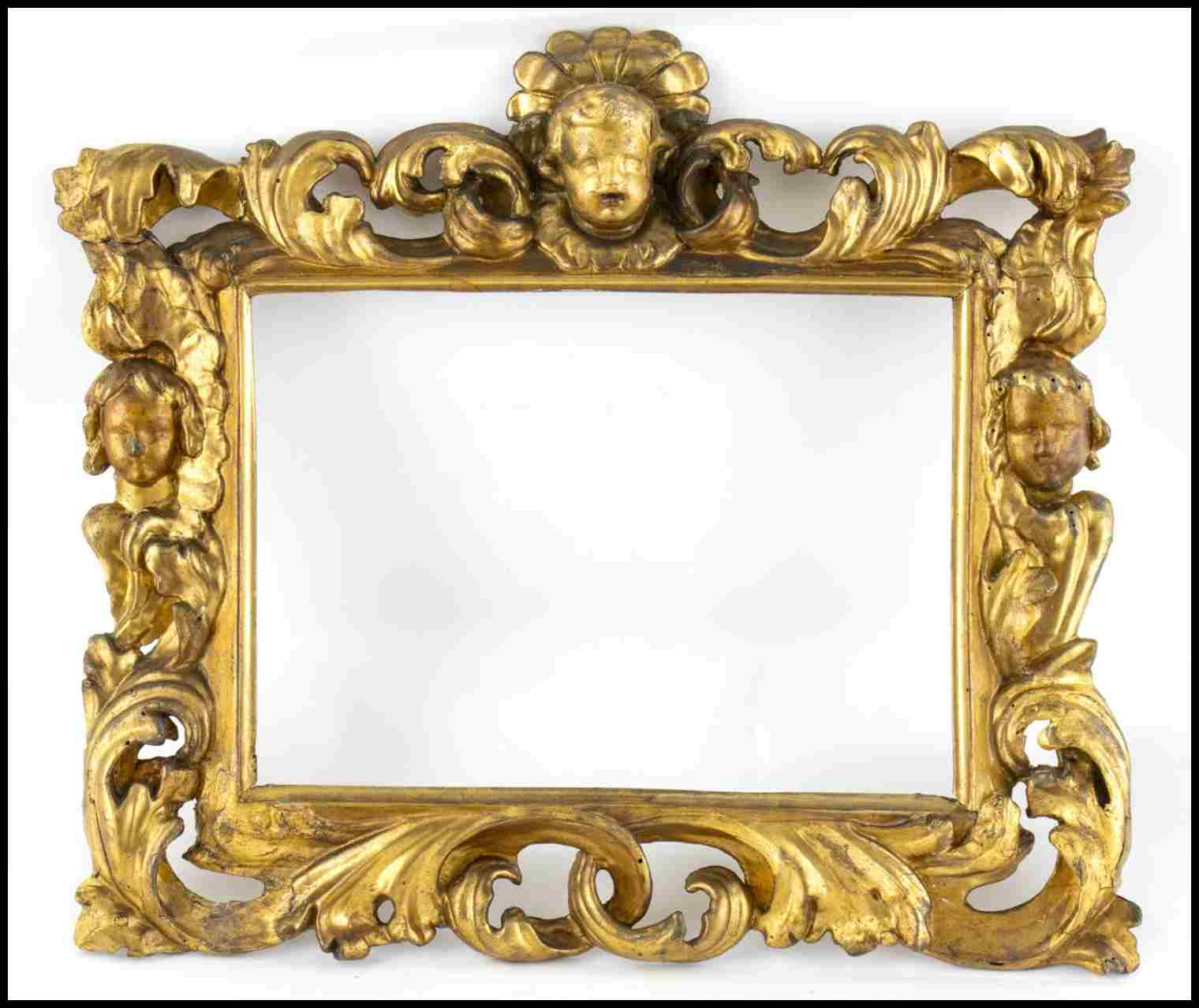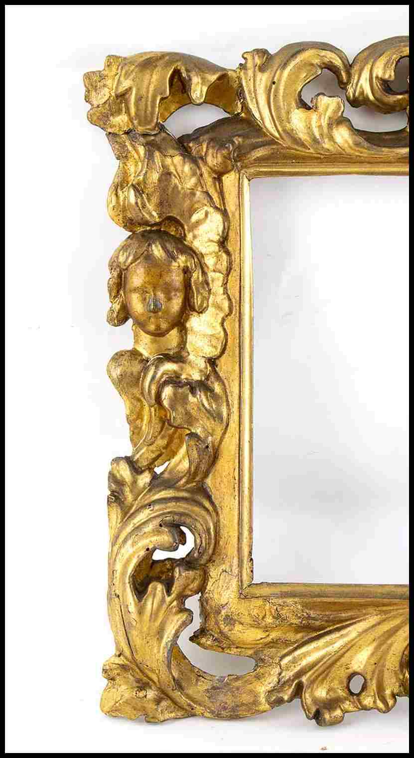 Legno scolpito e dorato, ingombro cm. 47,5x52,5; battuta cm. 27,1x37,1.