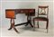 Firmato. Scrittoio in legno di mogano a due cassetti e alette laterali, con piano ricoperto in pelle, e una sedia in legno di mogano con seduta imbottita. Inghilterra. Inizi XX secolo. Mis. Lung. cm. 140 Alt. cm. 72 Prof. cm. 50 ca.