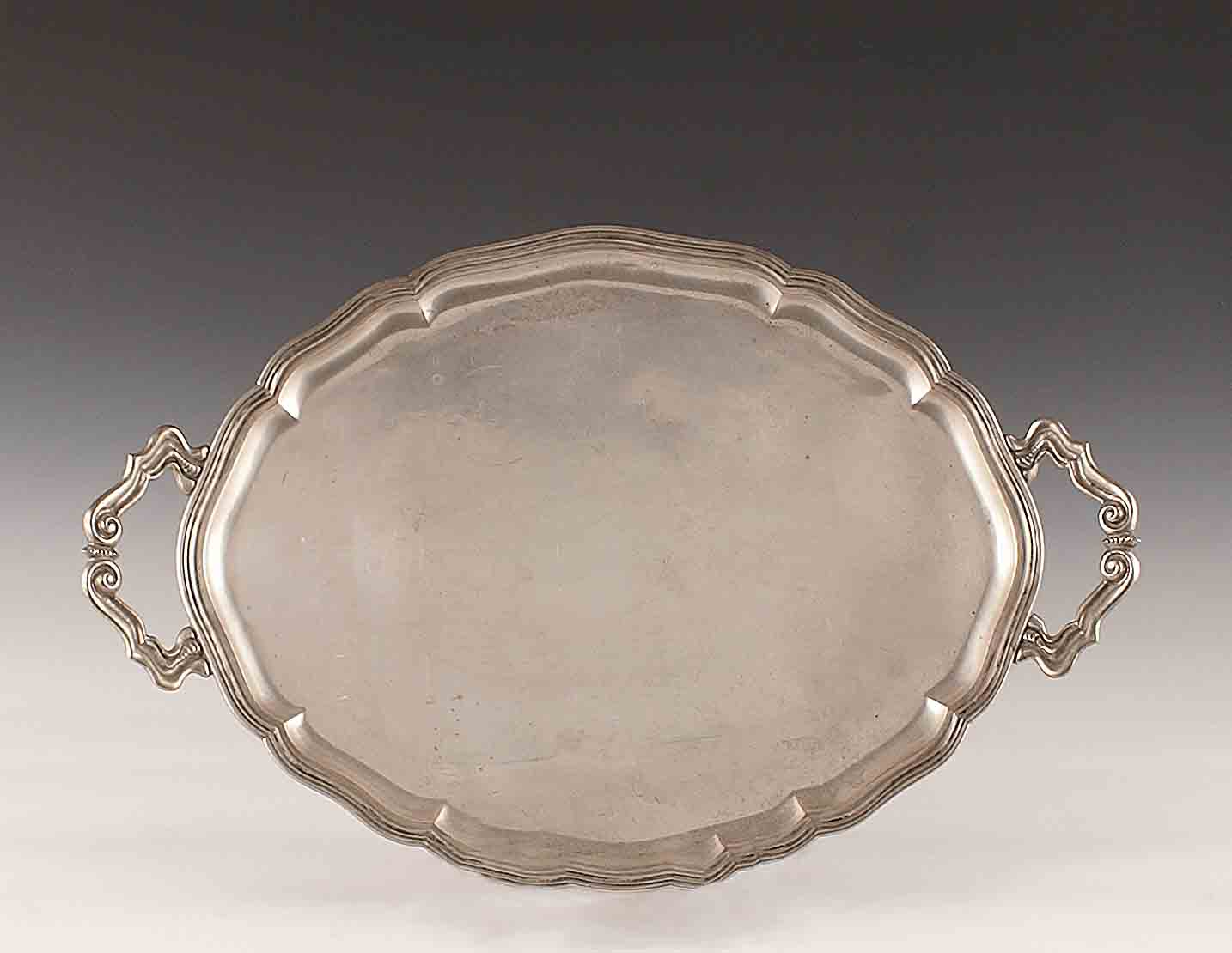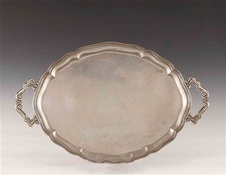 Vassoio in argento con due manici e profilo smerlato, vecchia manifattura, cm. 58x37, gr. 1630.