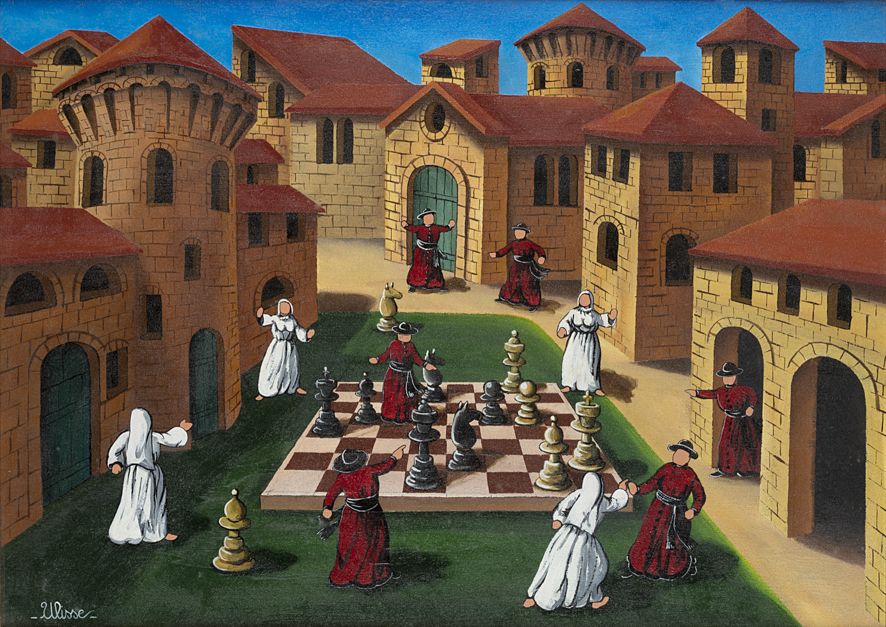 Ulisse Osimo 1957 Grande sfida a scacchi Olio su tavola 70 x 50 cm Firmato in basso a sinistra Archivio Ulisse al retro
