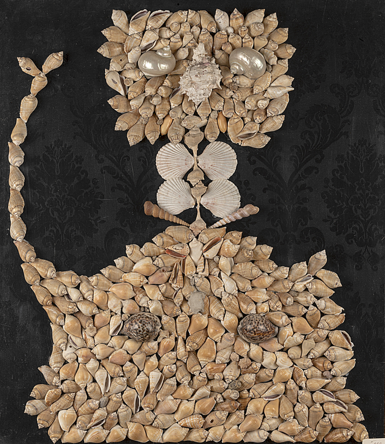 Baj Enrico Milano 1924 - Vergiate (Varese) 2003 Catherine Henriette de Balzac d'Entragues Marquise De Verneuil - 1978 Applicazione di conchiglie su damasco riportato su tavola 70 x 80 cm Firma e data al retro Multiplo - tiratura 100 esemplari Provenienza collezione privata
