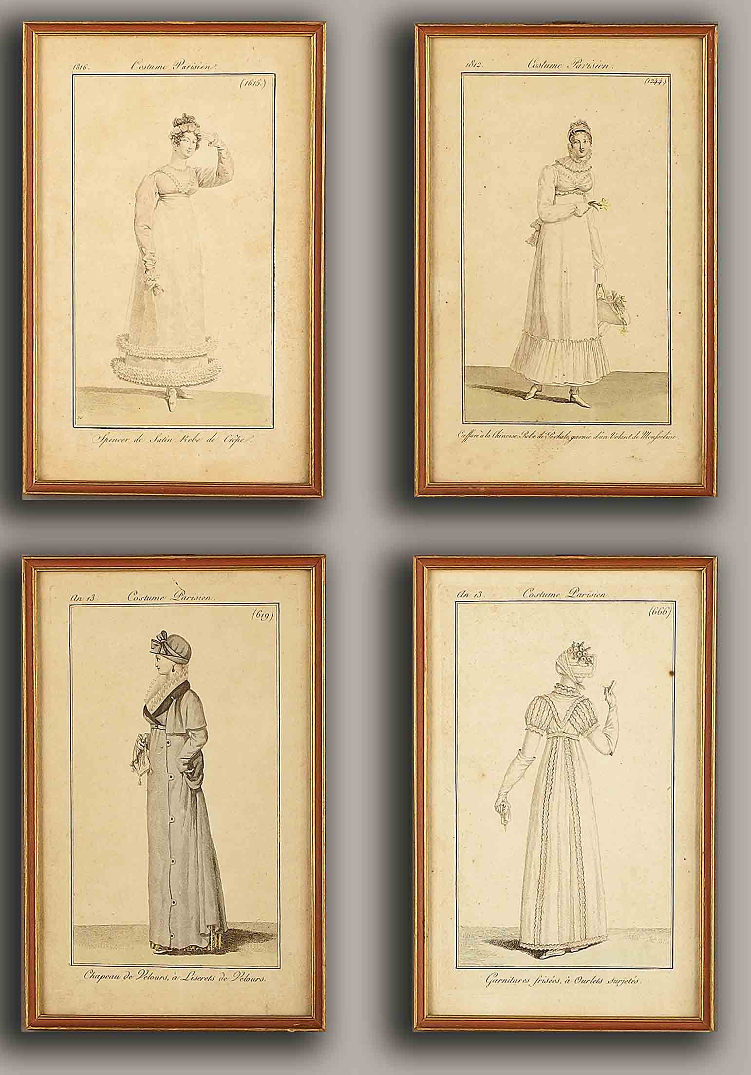 Lotto composto da quattro stampe francesi raffiguranti modelli di vestiti parigini del XIX secolo, cm. 18x12.