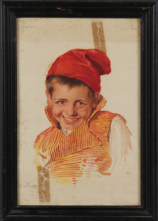 ANONIMO Ritratto di bimbo. Acquerello su carta. Cm 29,00 x 43,00. Firma Movagas in basso a sinistra. Cornice presente