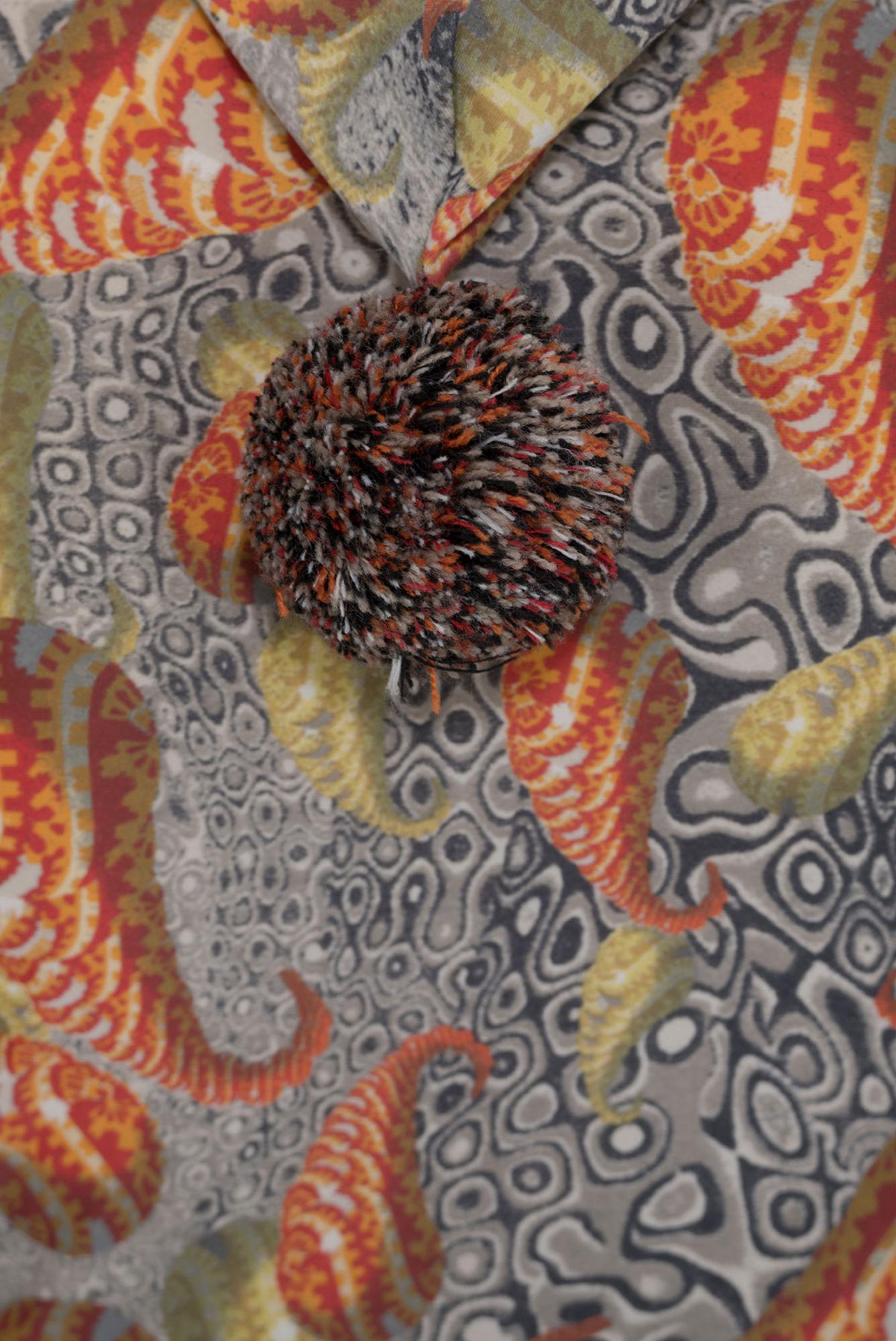 Iconic catsuit with shell print from the 90's, hood with pom pom detail, zip closure at front and belt. Size M.