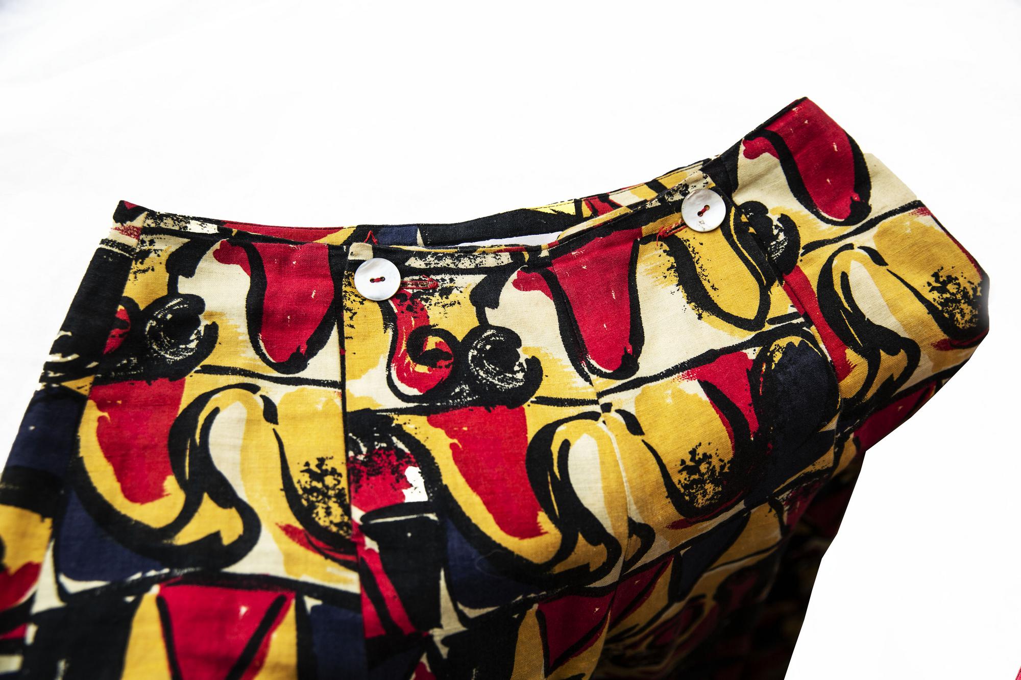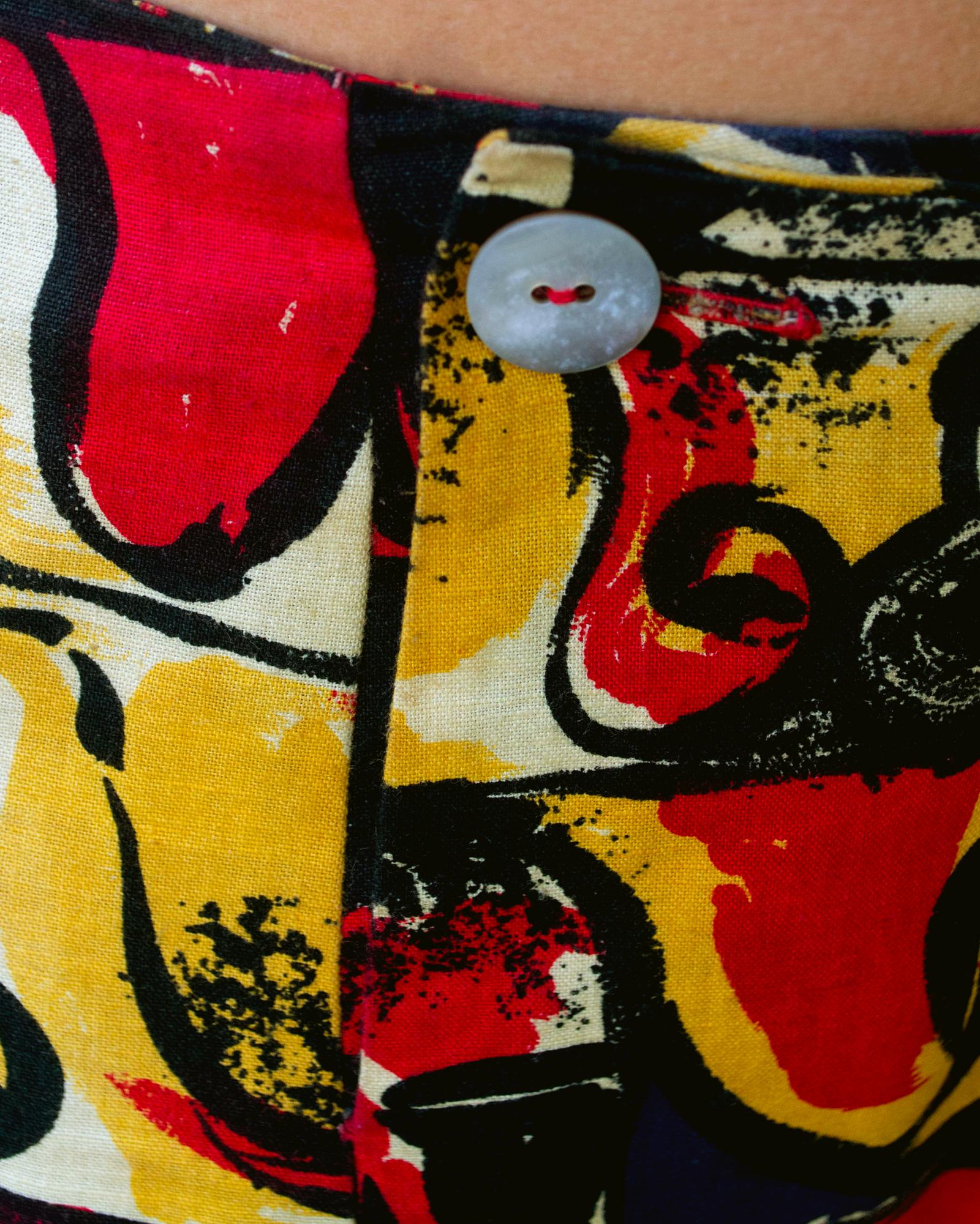 Printed silk bourette for this wide baiadera trouser detailed by a marine-inspired lacing with a panel with two mother-of-pearl buttons. Ankle length. Made in Italy. 1989. Size IT 42. Perfectly preserved