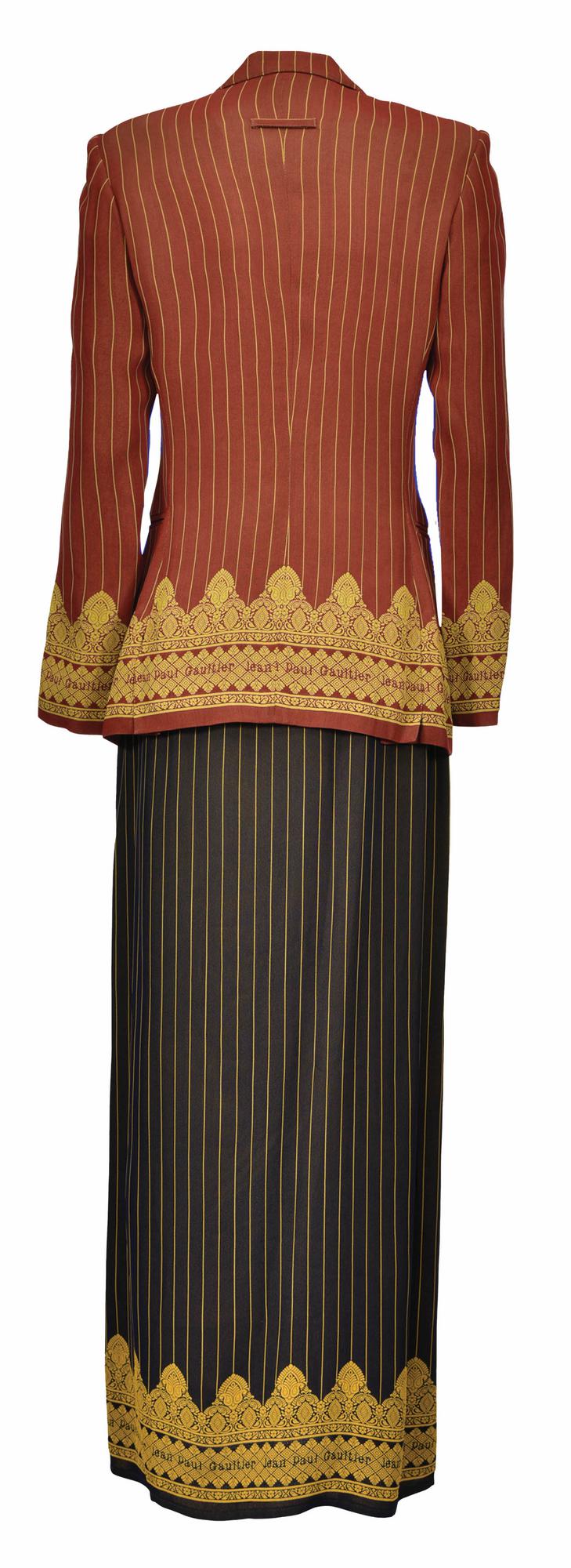 Pinstripe jacquard suit, red and yellow blazer with two pockets and two inner buttons, navy and yellow deep slit skirt with smoking belt, from SS 97 collection.