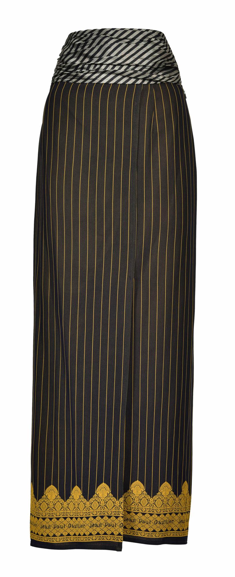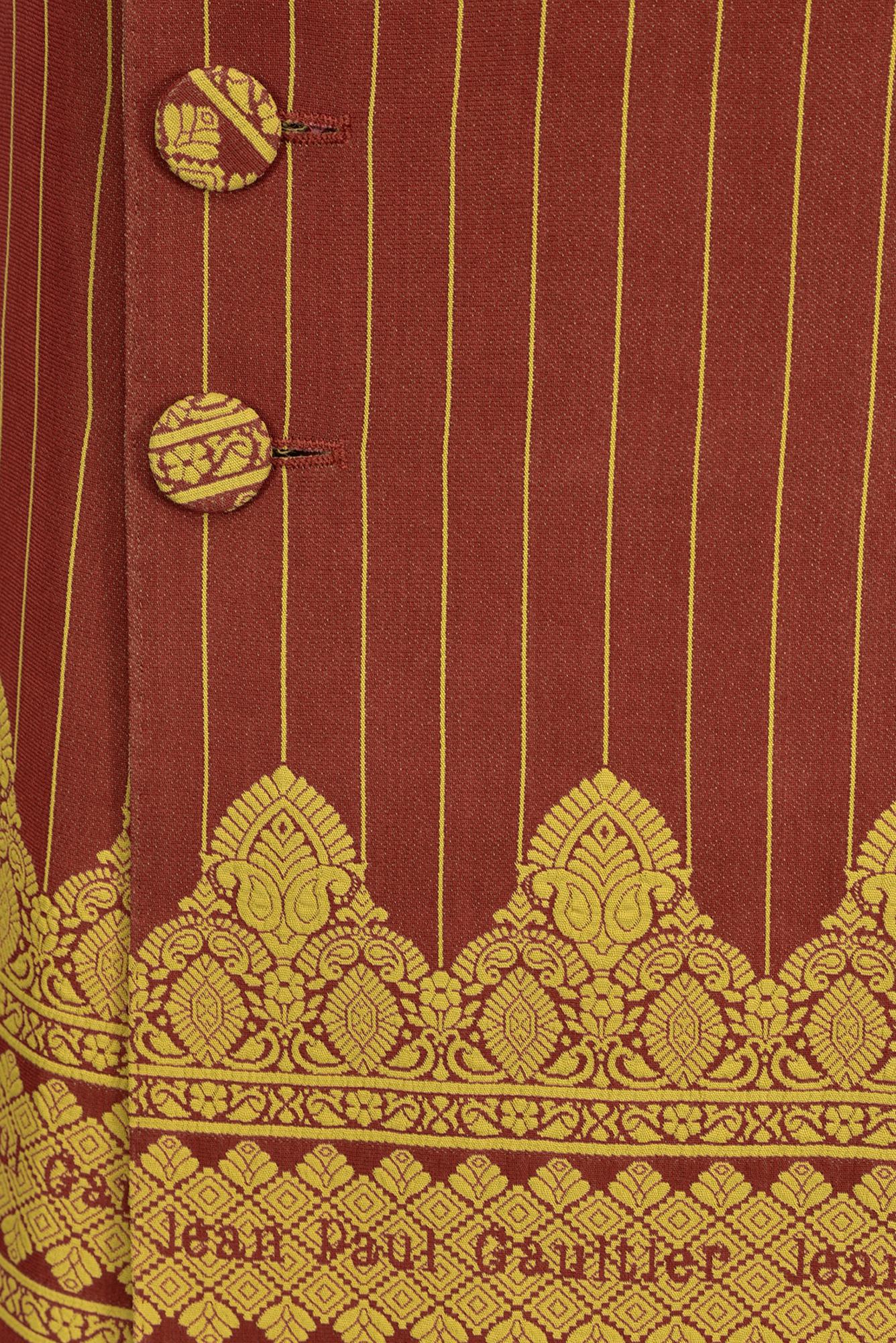 Completo a righe jacquard, blazer rosso e giallo con due tasche e due bottoni interni, gonna navy e gialla con profondo spacco e fascia smoking, della collezione SS 97. Brand arabesco jacquard ai bordi. Taglia IT 40.