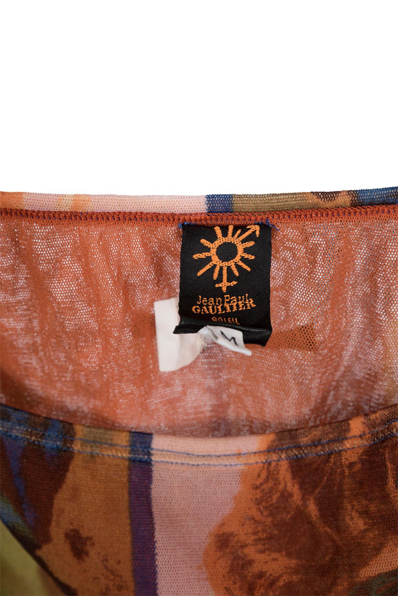 Iconica gonna lunga Soleil in maglia di rete stampata con base violae e ritratti vintage della SS 02, fodera a contrasto. Taglia M. 100% nylon. Eccellente.