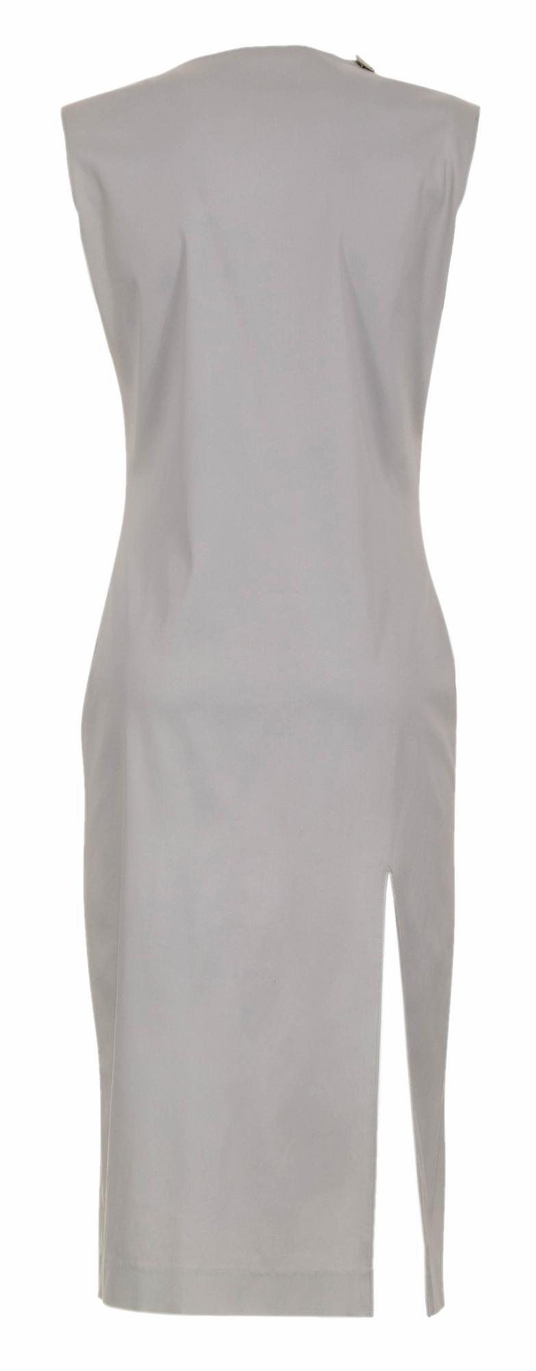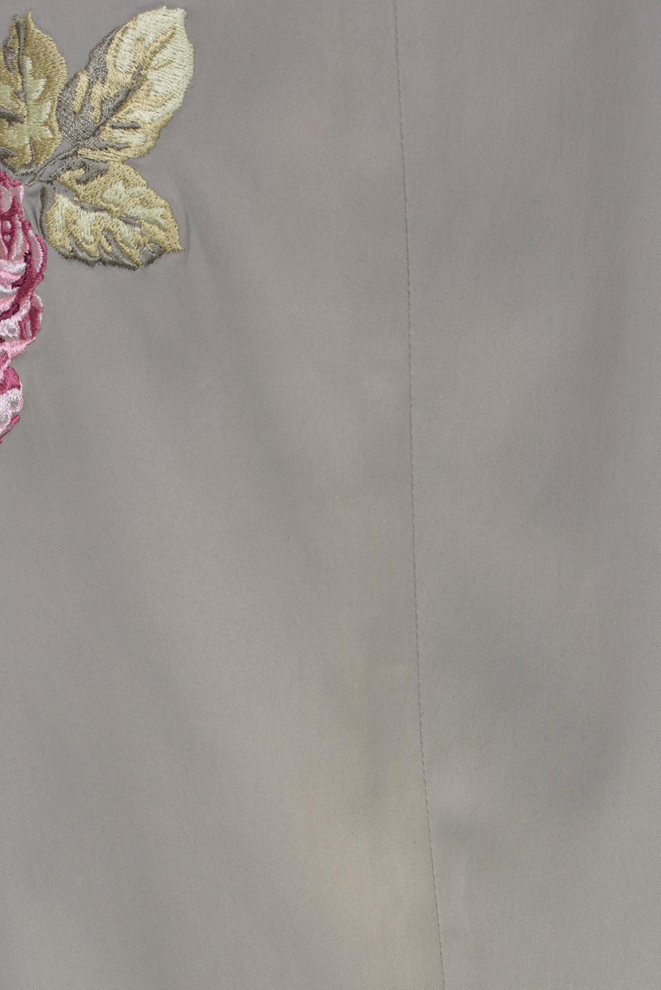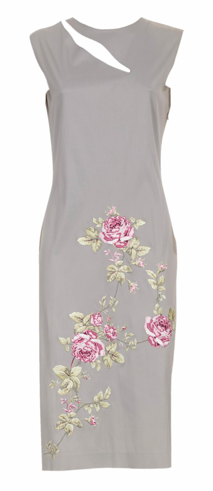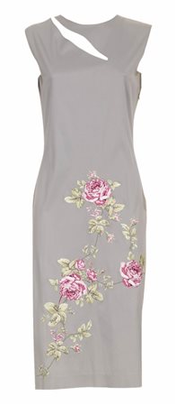 Sleeveless dress with flower embroideries from FW 97 'It's a jungle out there' collection, light grey with pink flowers, cut out at front neckline, side zip and slit at back.