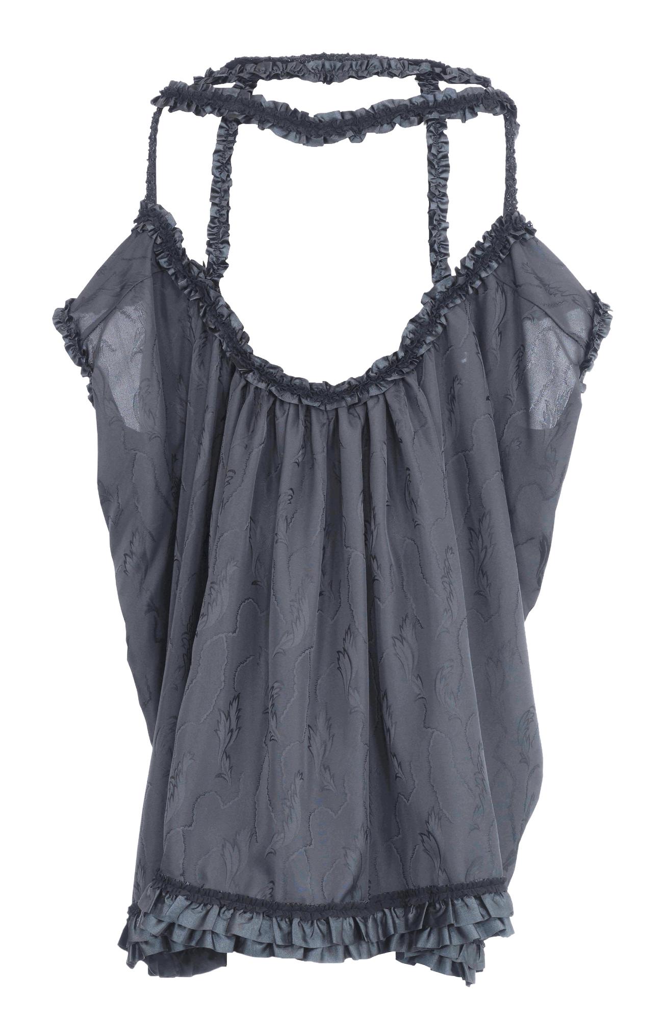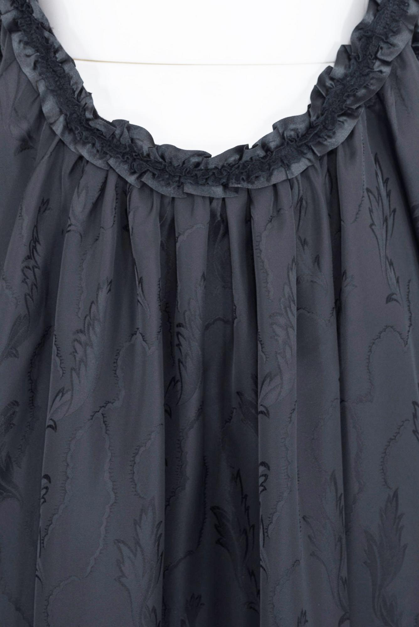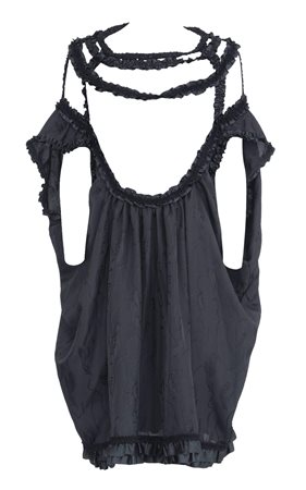 Oversize black jacquard fabric dress with mixed fabrics ruffle trims, from FW 08 collection, wide cut out at front and back.