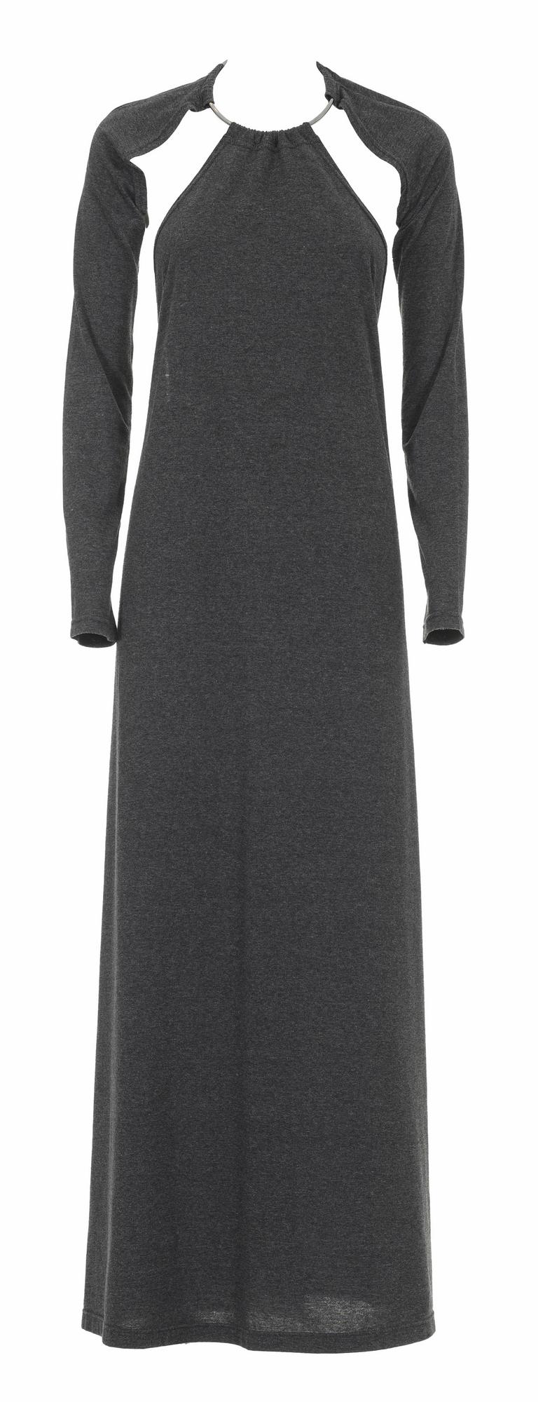 Wrap jersey dress with metal choker from SS 99 collection, detachable sleeves, open back with two buttons closure at back. Size M.