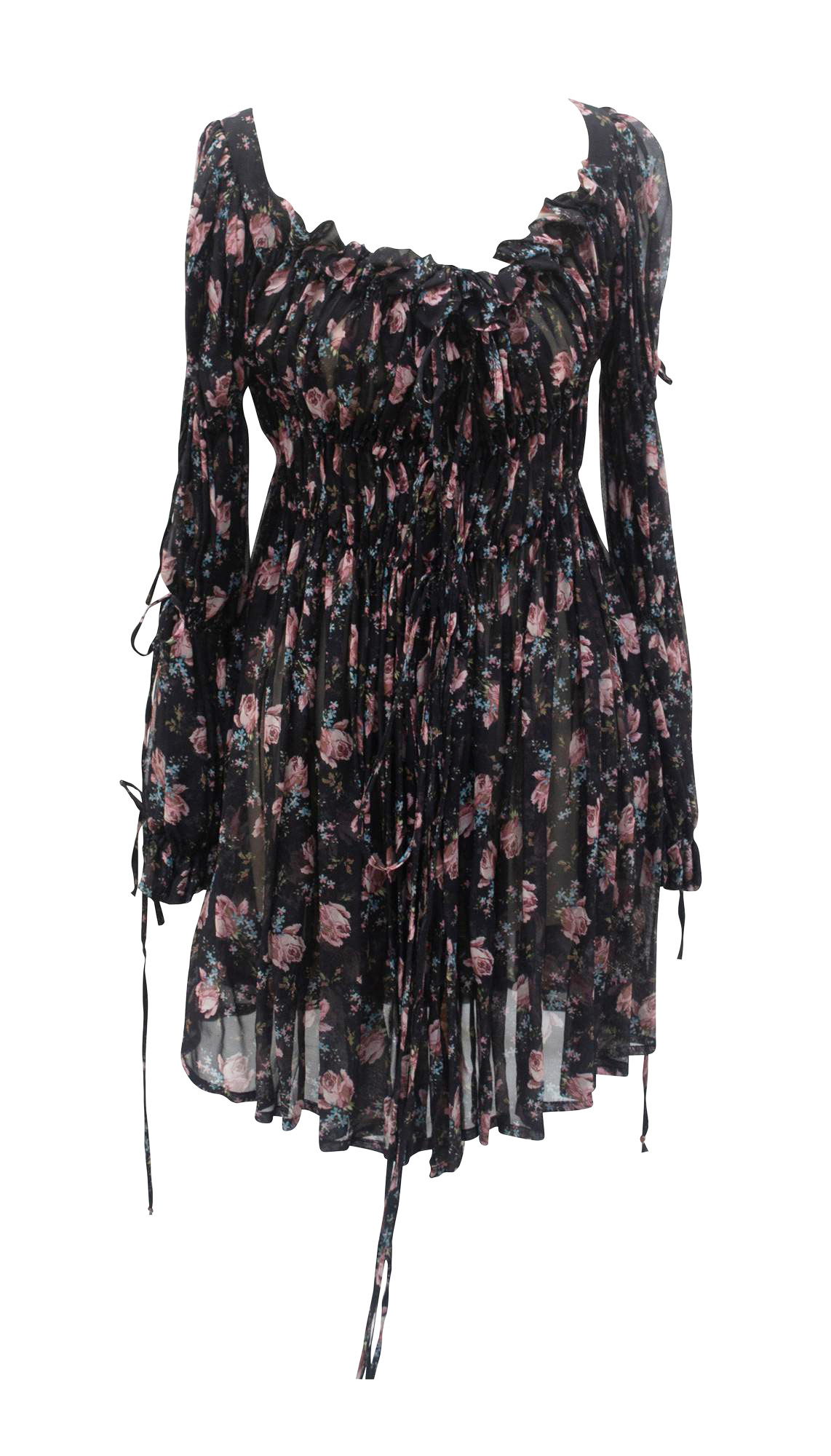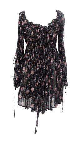 Blouse dress in silk georgette printed in flowers on black background. The width of the sleeves and of the body is adjusted through the drawstring fastening. Uk size 10. Made in England. Excellent condition.