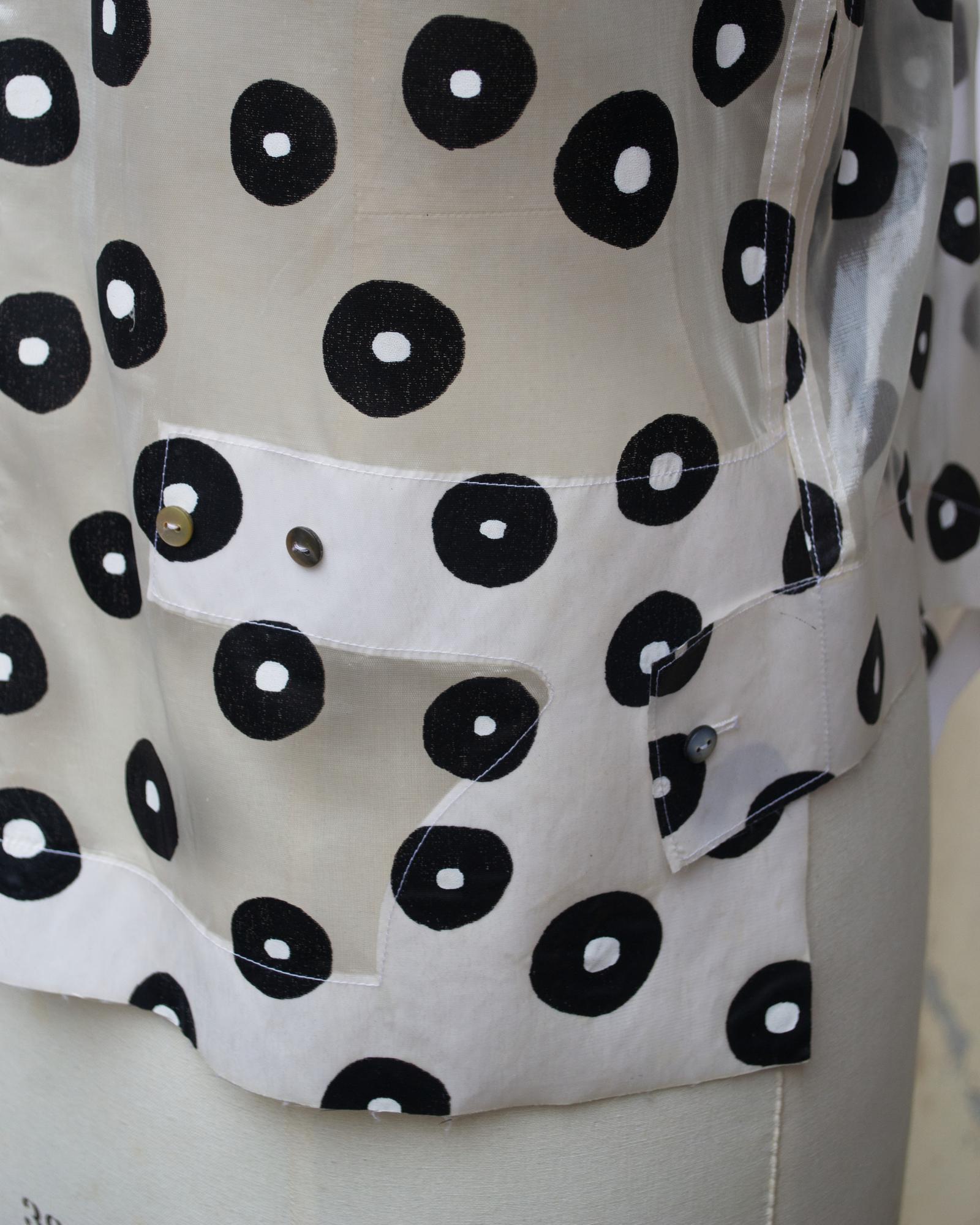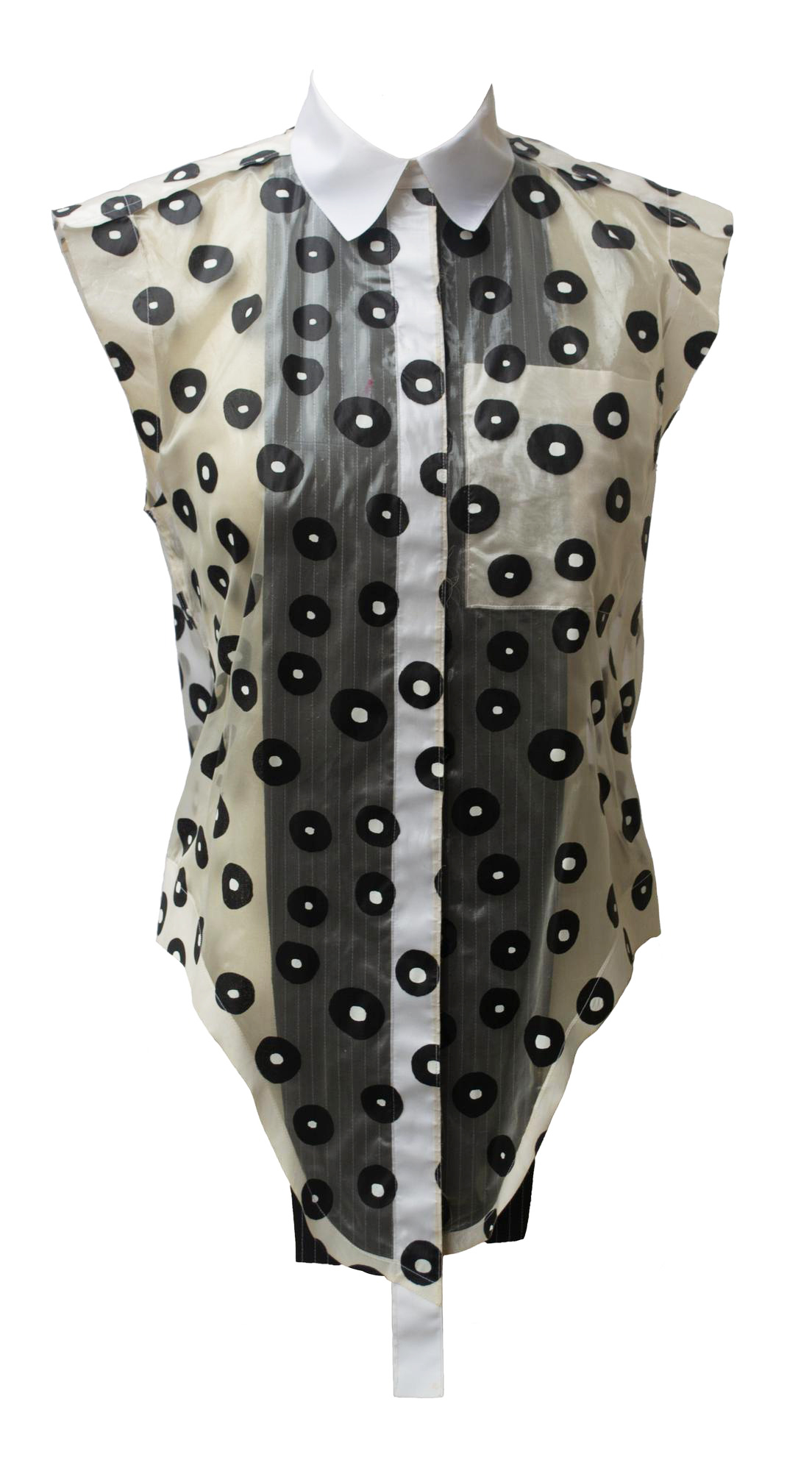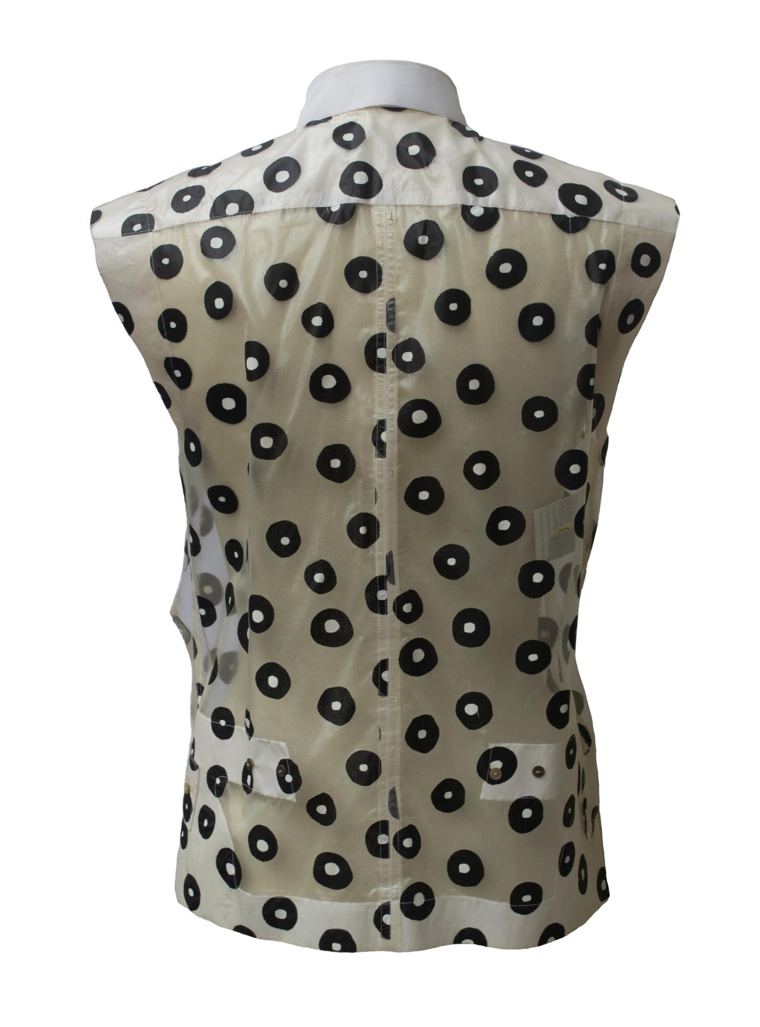 Poliestere e seta e colletto e lista in poliuretano per questa camicia tecno sartoriale completamente termo saldata. Made in Italy. FR size 38. Primi anni 2000. Ben conservata.