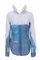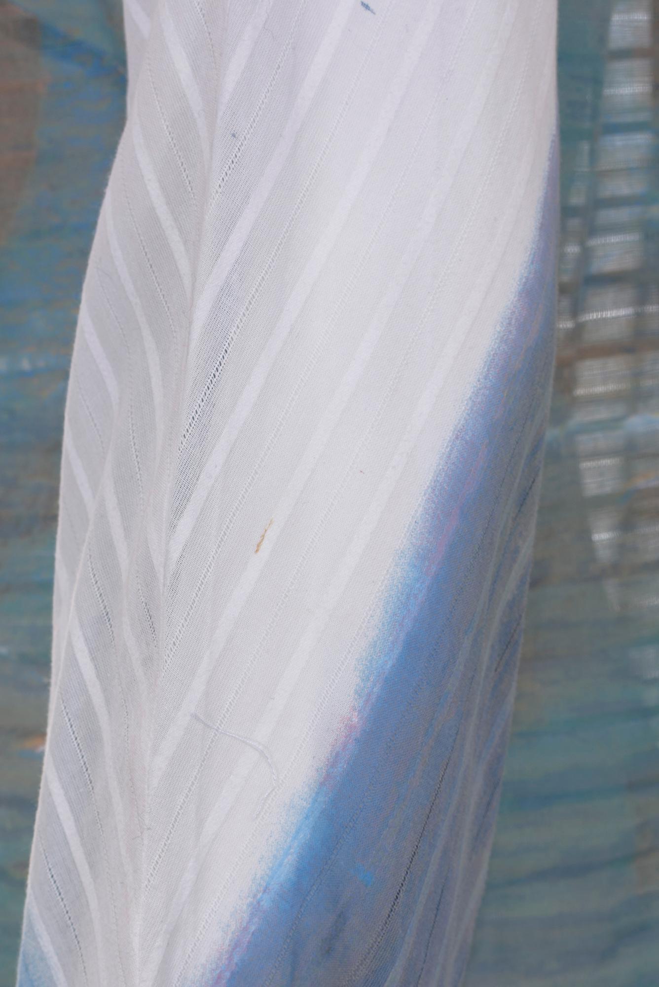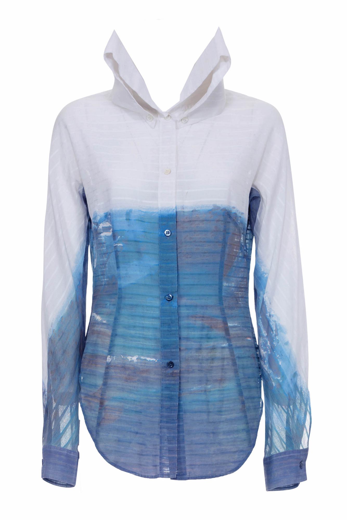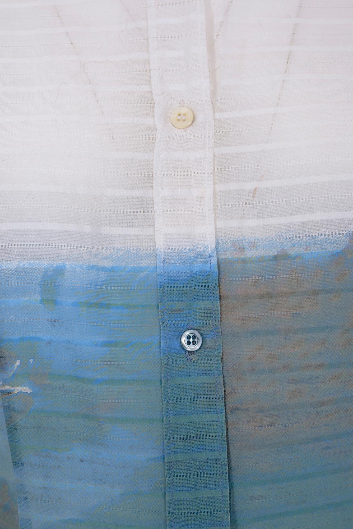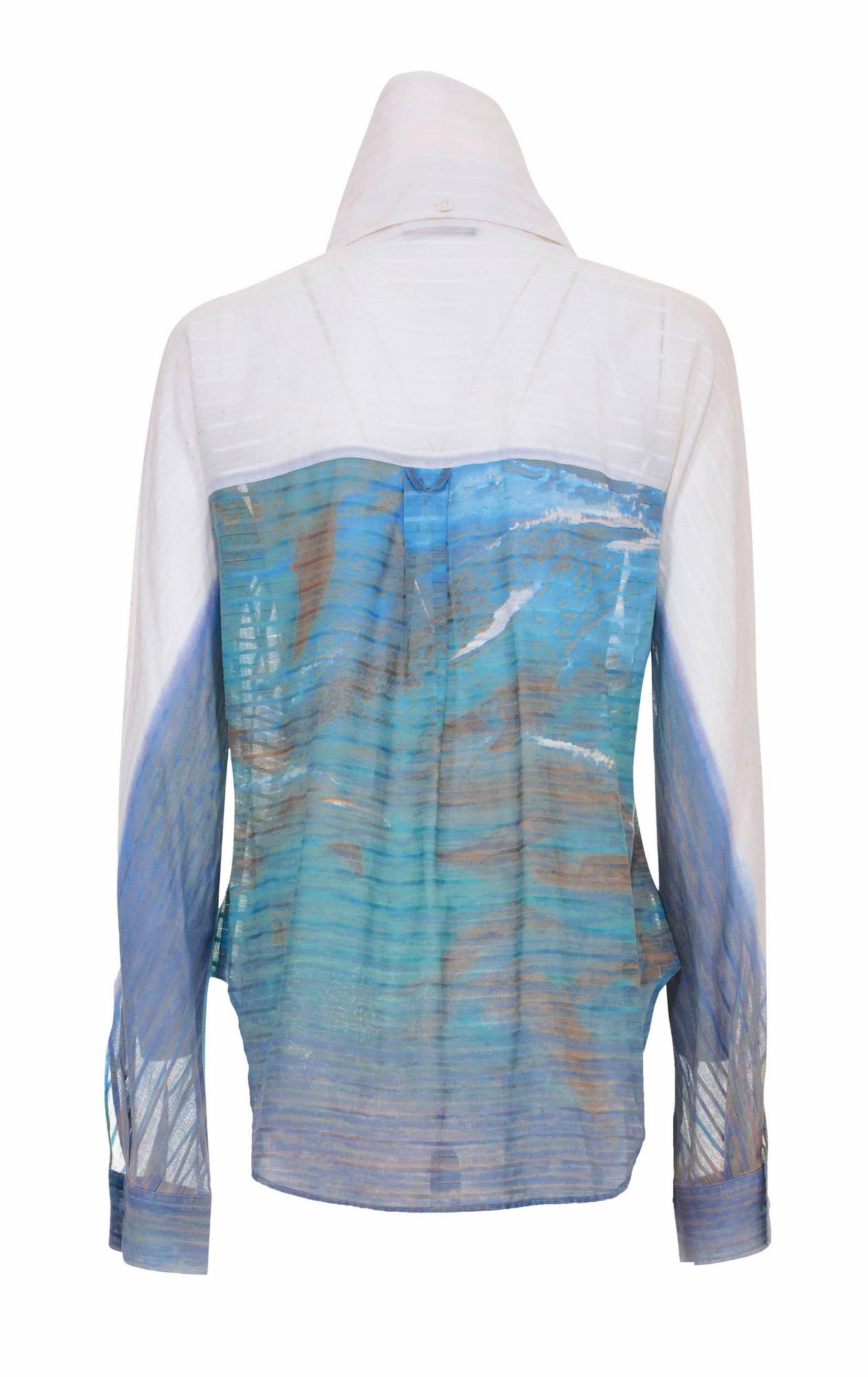 Rara camicia bianca rigata dipinta a mano della collezione SS 97 'Bellmer la poupee', bordi arrotondati, colletto molto alto rigirato.