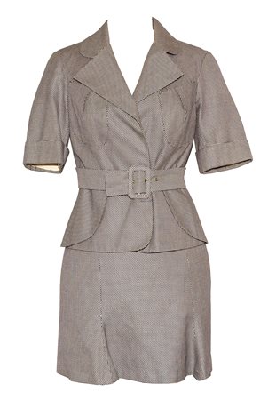 Completo in cotone disegno optical bianco e nero composto da: giacca 3 bottoni foderata modello Bettina con cintura e maniche corte, gonna foderata. Made in Italy primi anni 90. Taglia IT 42. Perfettamente conservato.