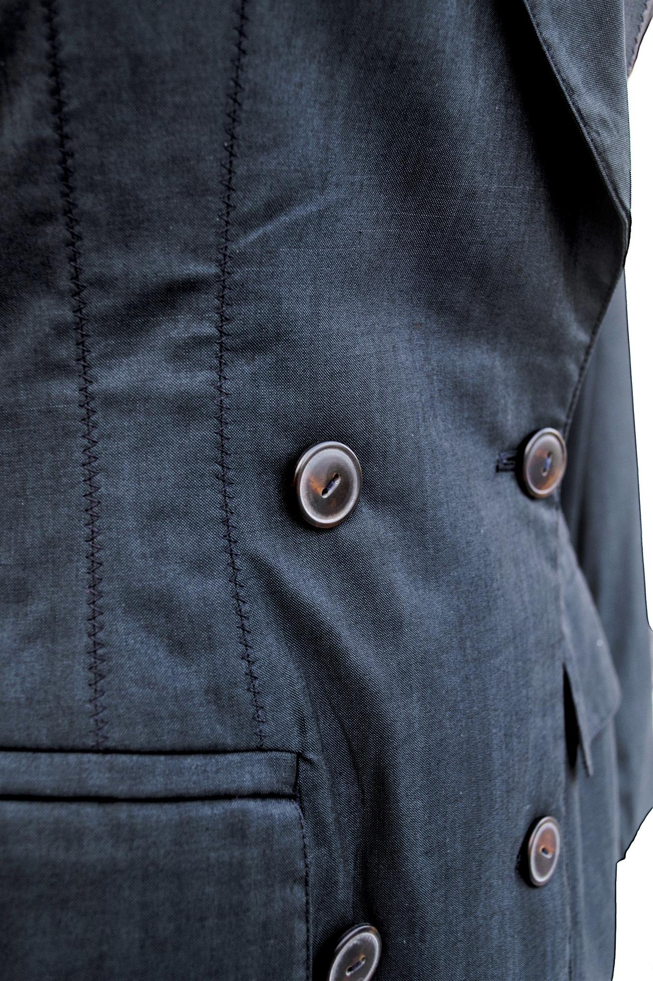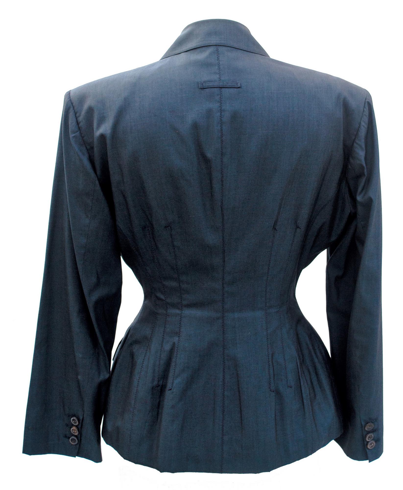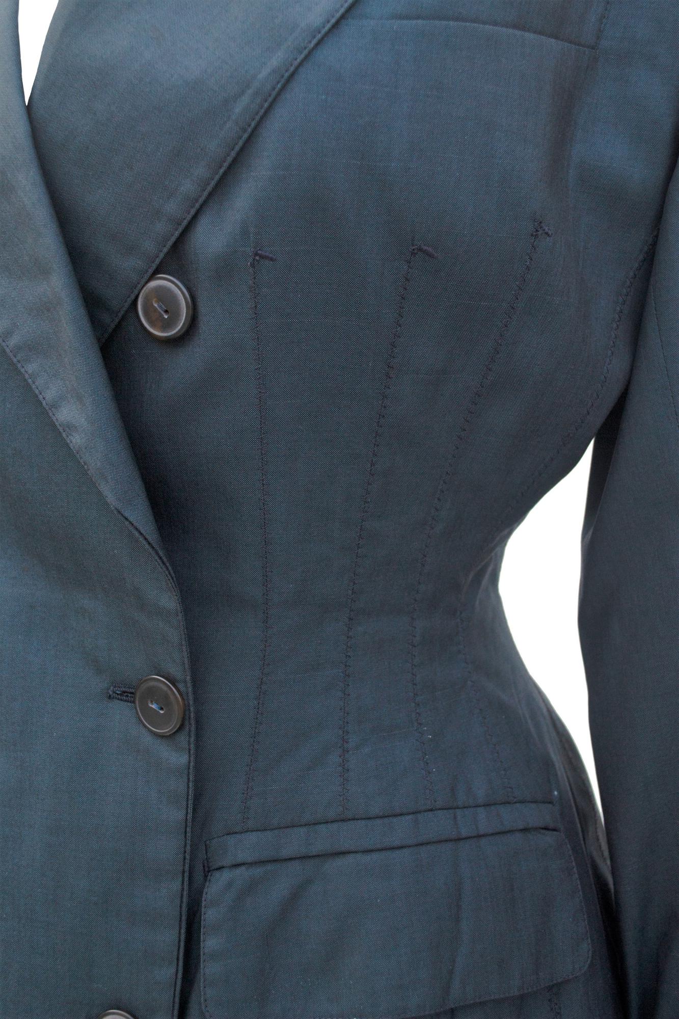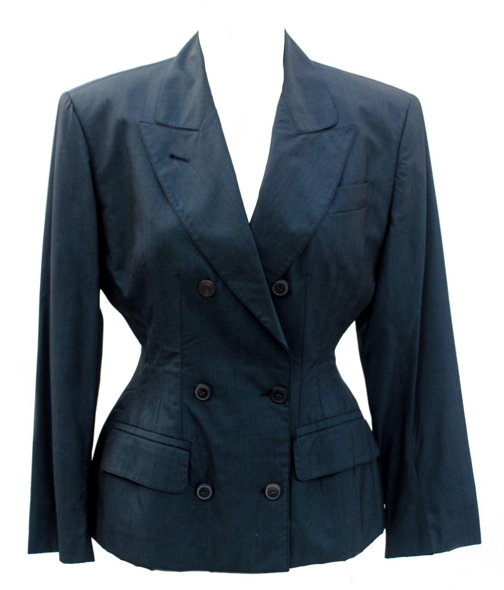 Descrizione:Giacca doppiopetto in cotone e seta blu cangiante. Foderata in twill nero, leggera imbottitura sui fianchi per dare la forma iconica, dettagli sartoriali, spalline. Tasche con patta. Prodotto in Italia negli anni '80. Taglia IT 42. Perfettamente conservata.