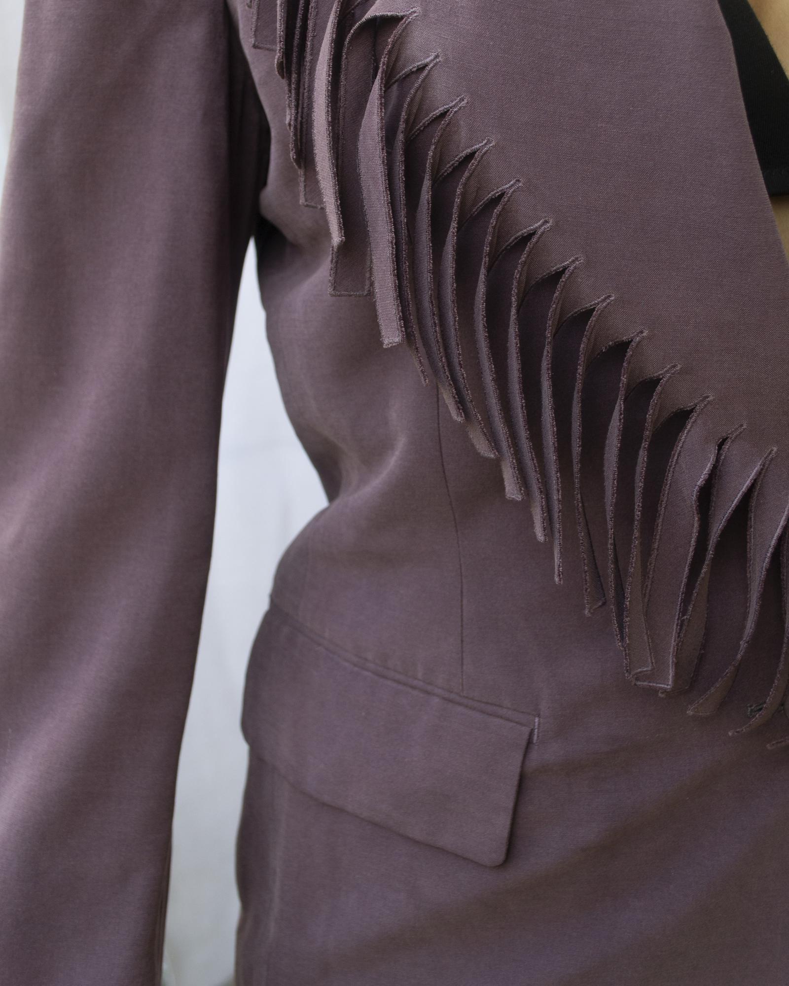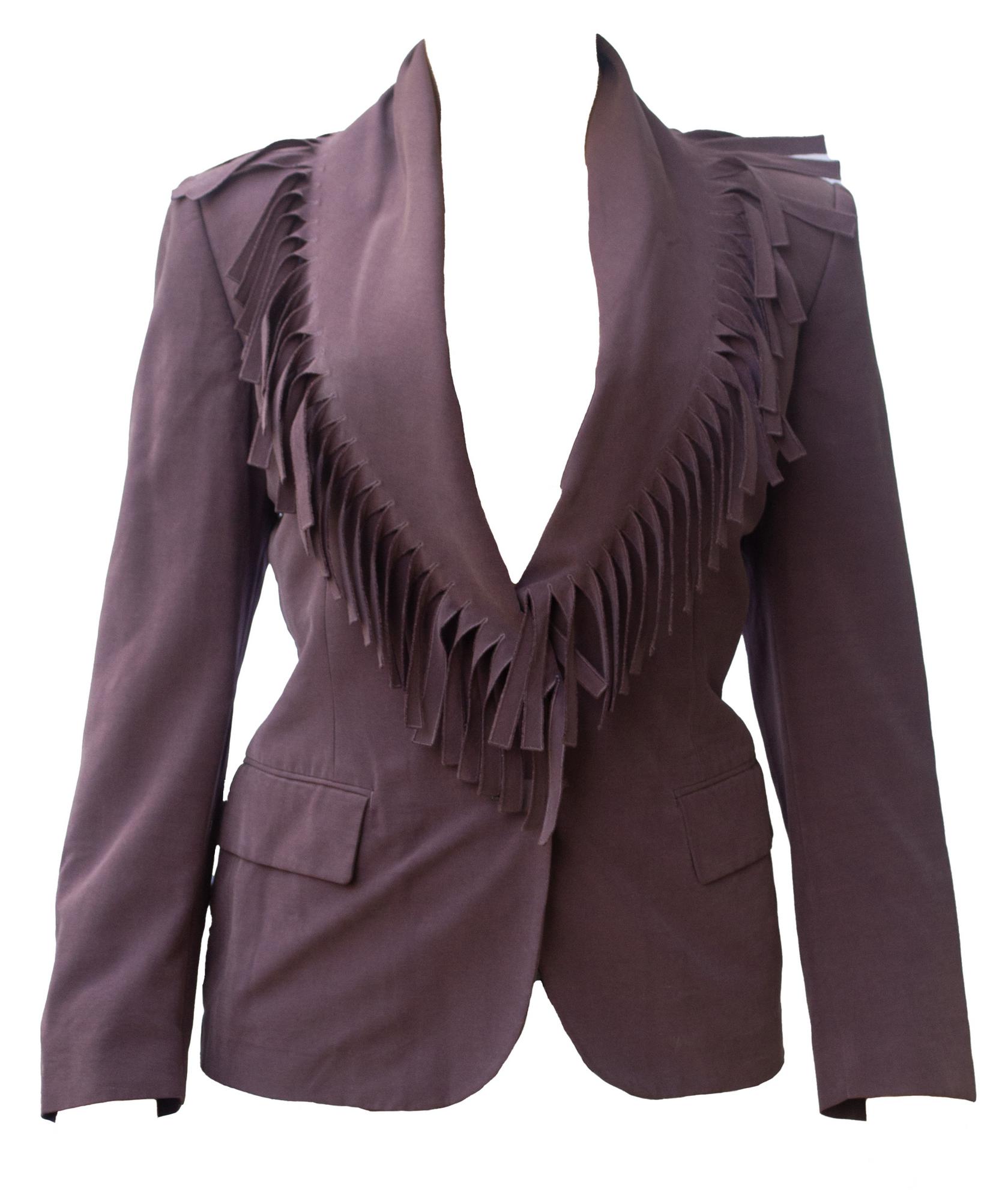 Mauve color for this half lined jacket in pure silk with fringed shawl collar. Pockets with flaps. Buttons covered in self fabric. Shoulder pads. Early 80's, made in Italy. Italian size 44. Perfectly preserved.