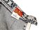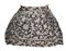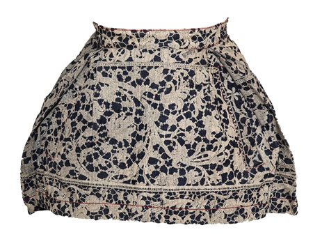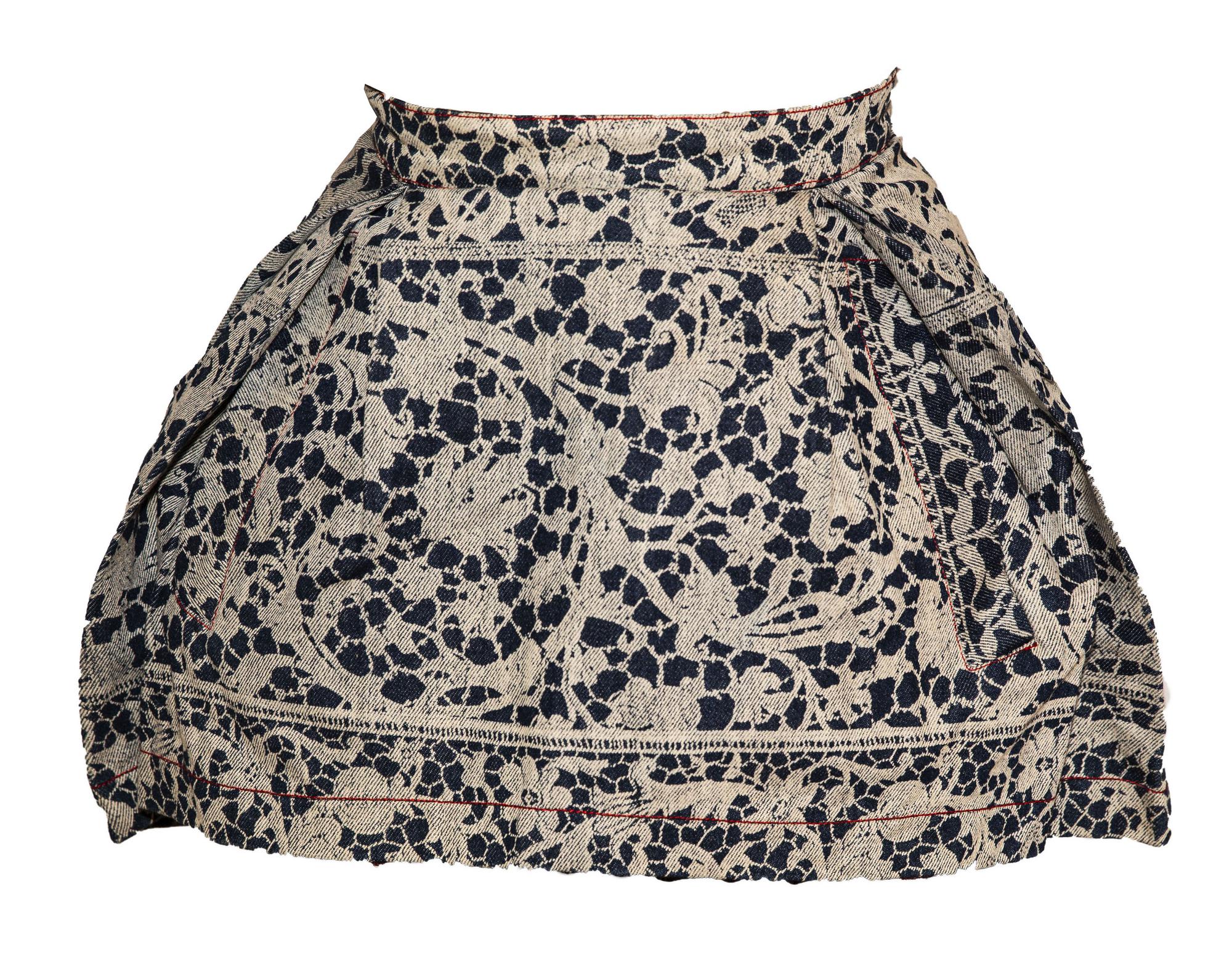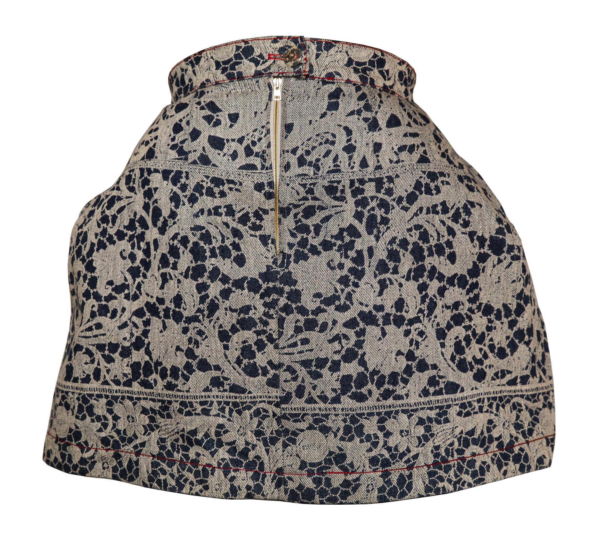 Unlined mini skirt in lace print denim with red stitching, perspex button with orb, metal zip at the center back, two side pockets under the flaps on the front. Made in England in 1993, size 12. Perfectly preserved.