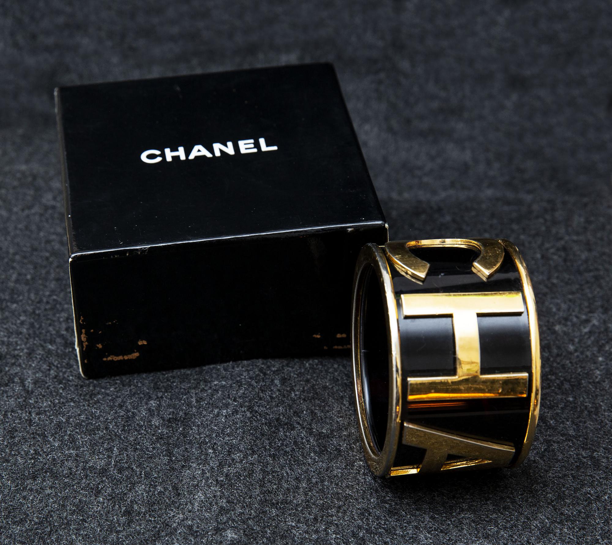 Iconic rigid bracelet with large golden Chanel writing on a black enamel background, complete with box. 1980s. Well preserved.
