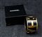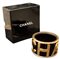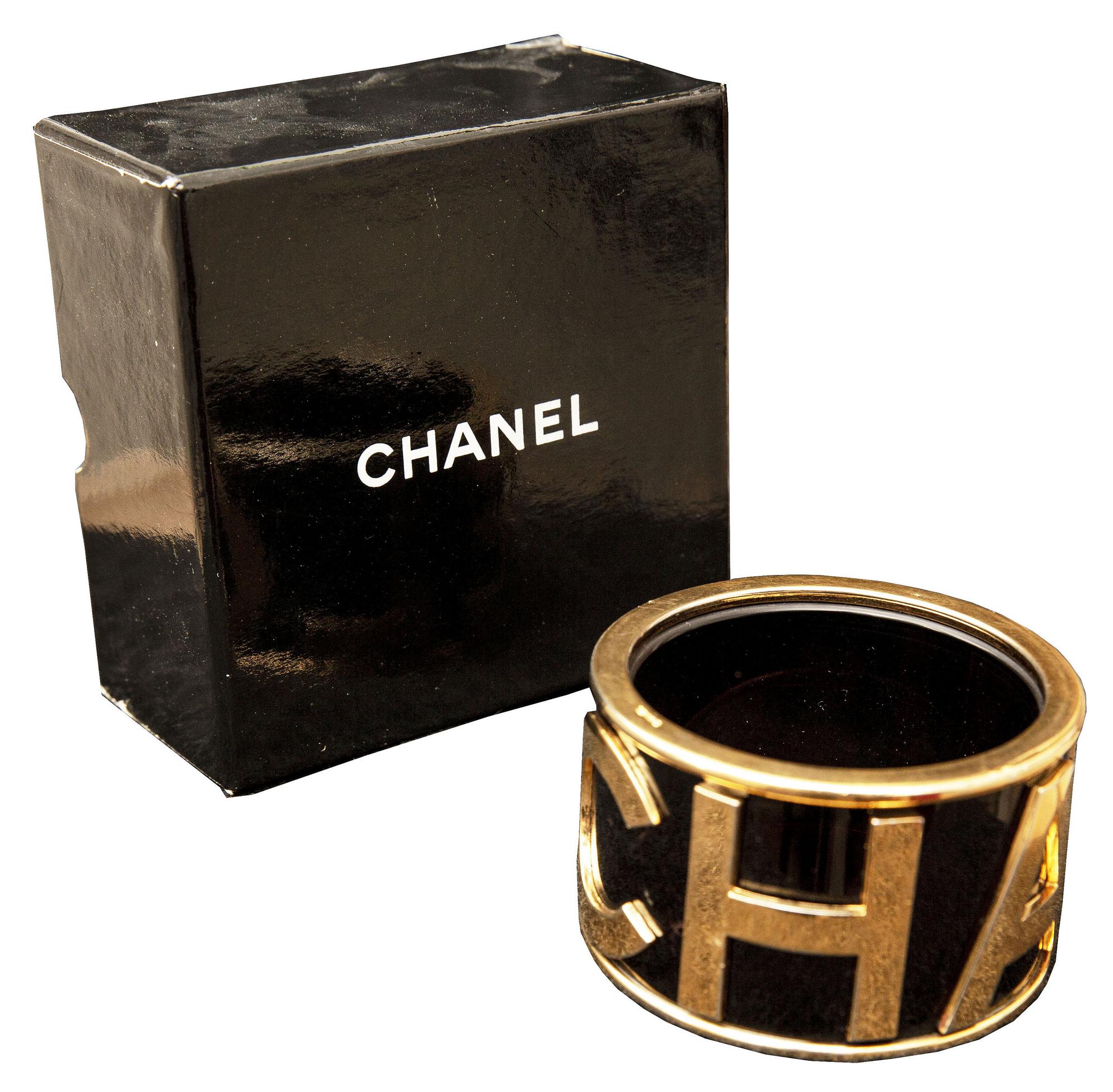 Iconico bracciale rigido con grande scritta dorata Chanel su fondo smaltato nero, completo di scatola. Anni '80. Ben conservato.