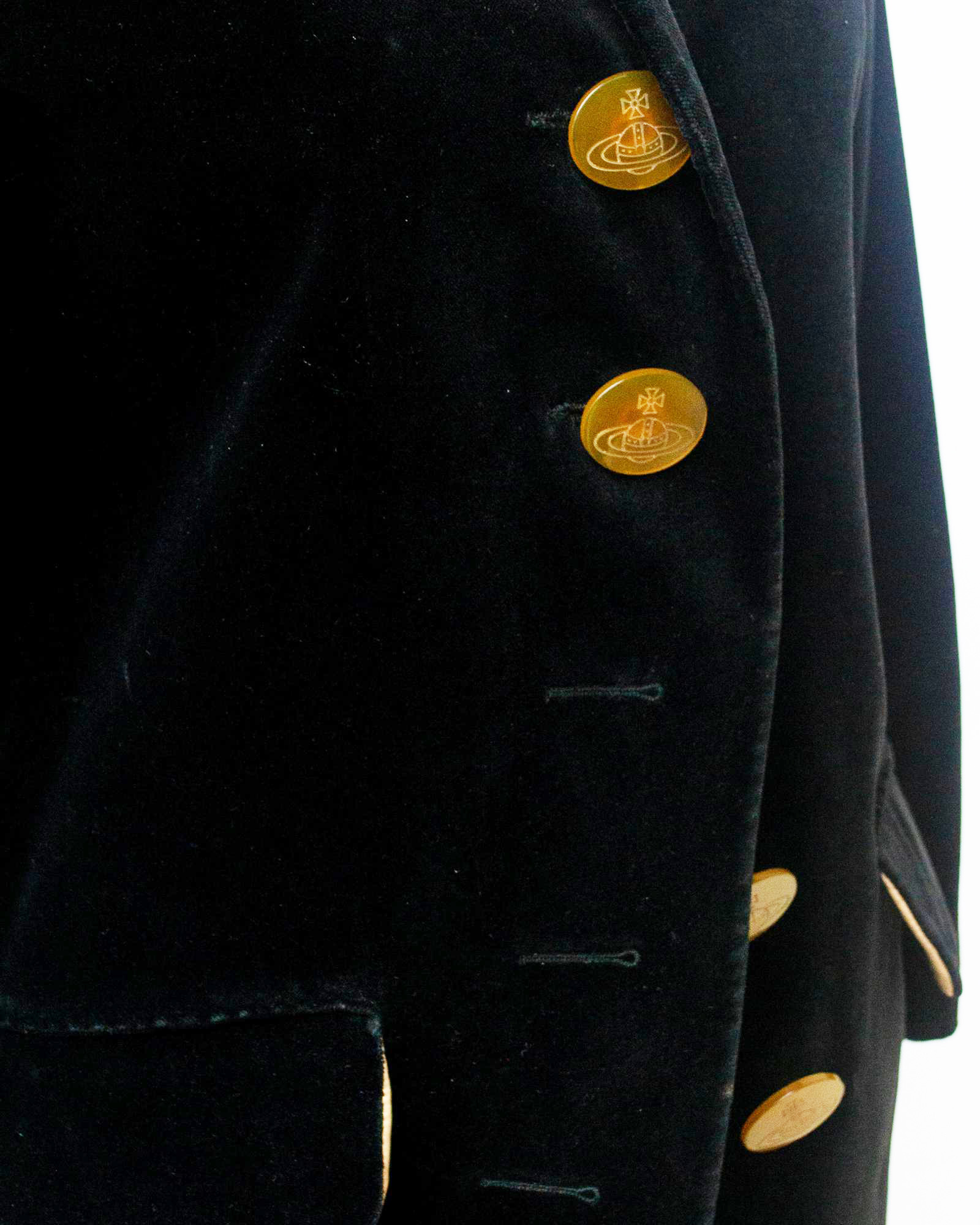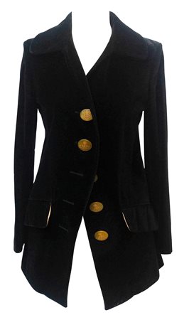 Giacca DL foderata in jacquard e realizzata in velluto nero. Bottoni giganti con logo Orb, tasche con patta. Primi anni '90, Made in Italy, taglia italiana 42. Perfettamente conservata.