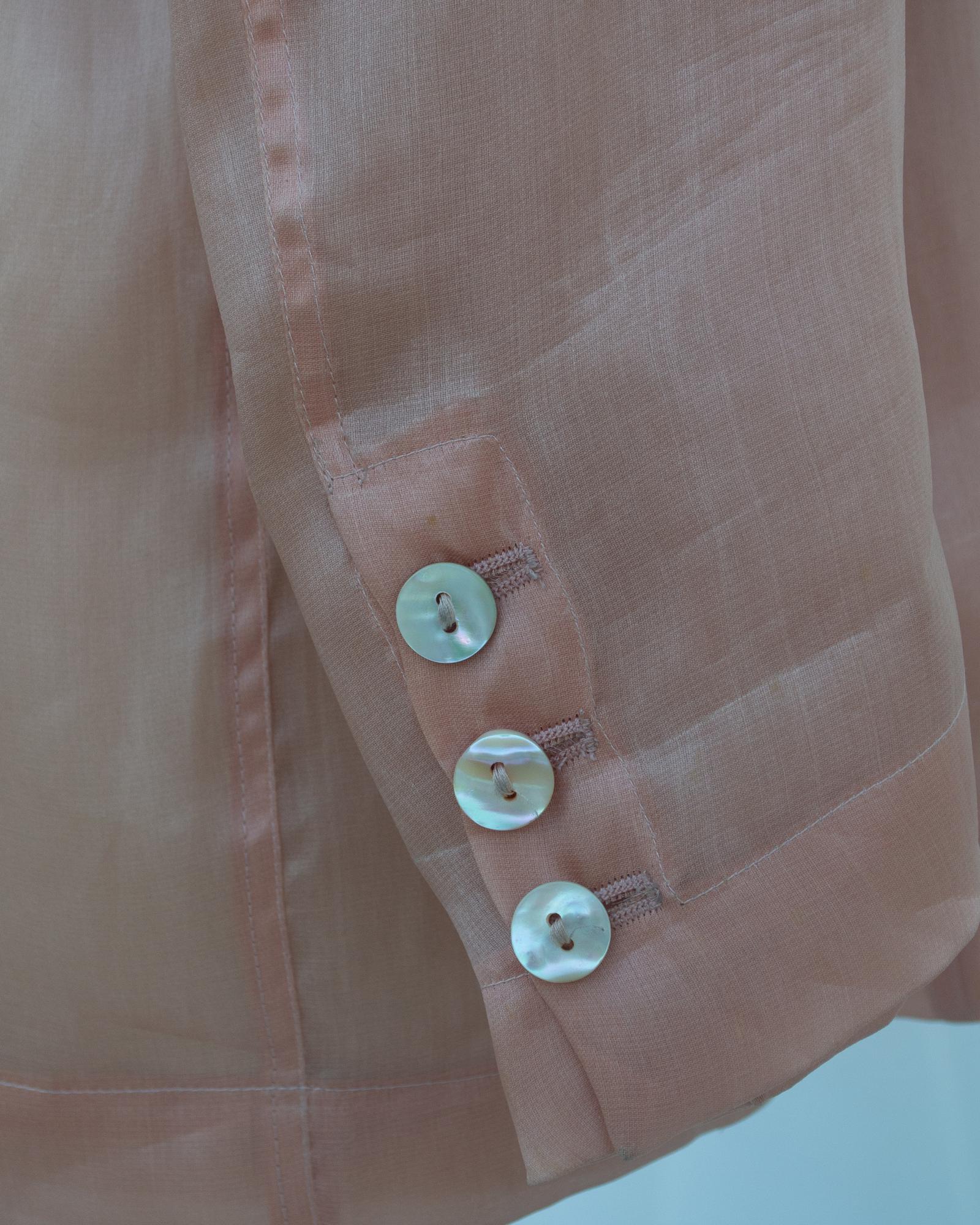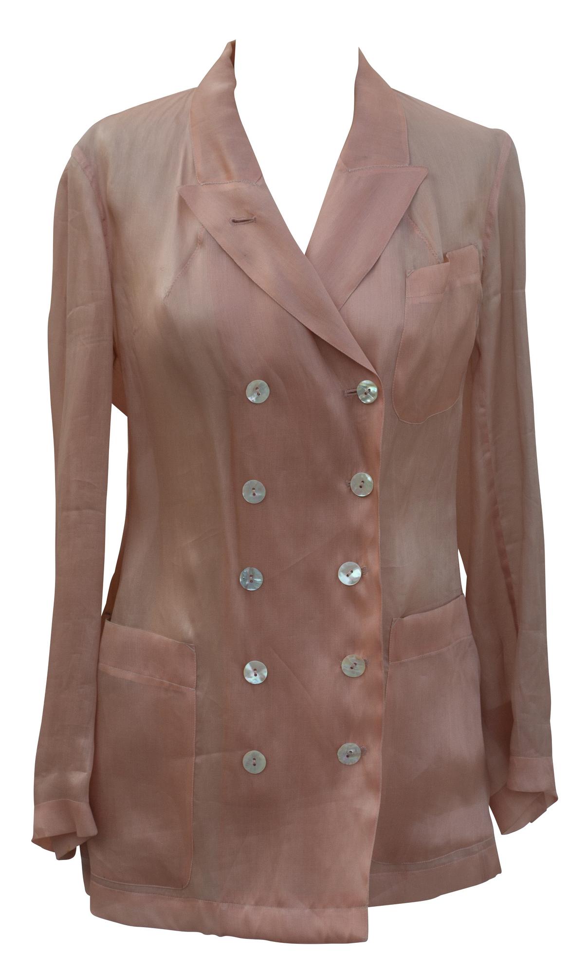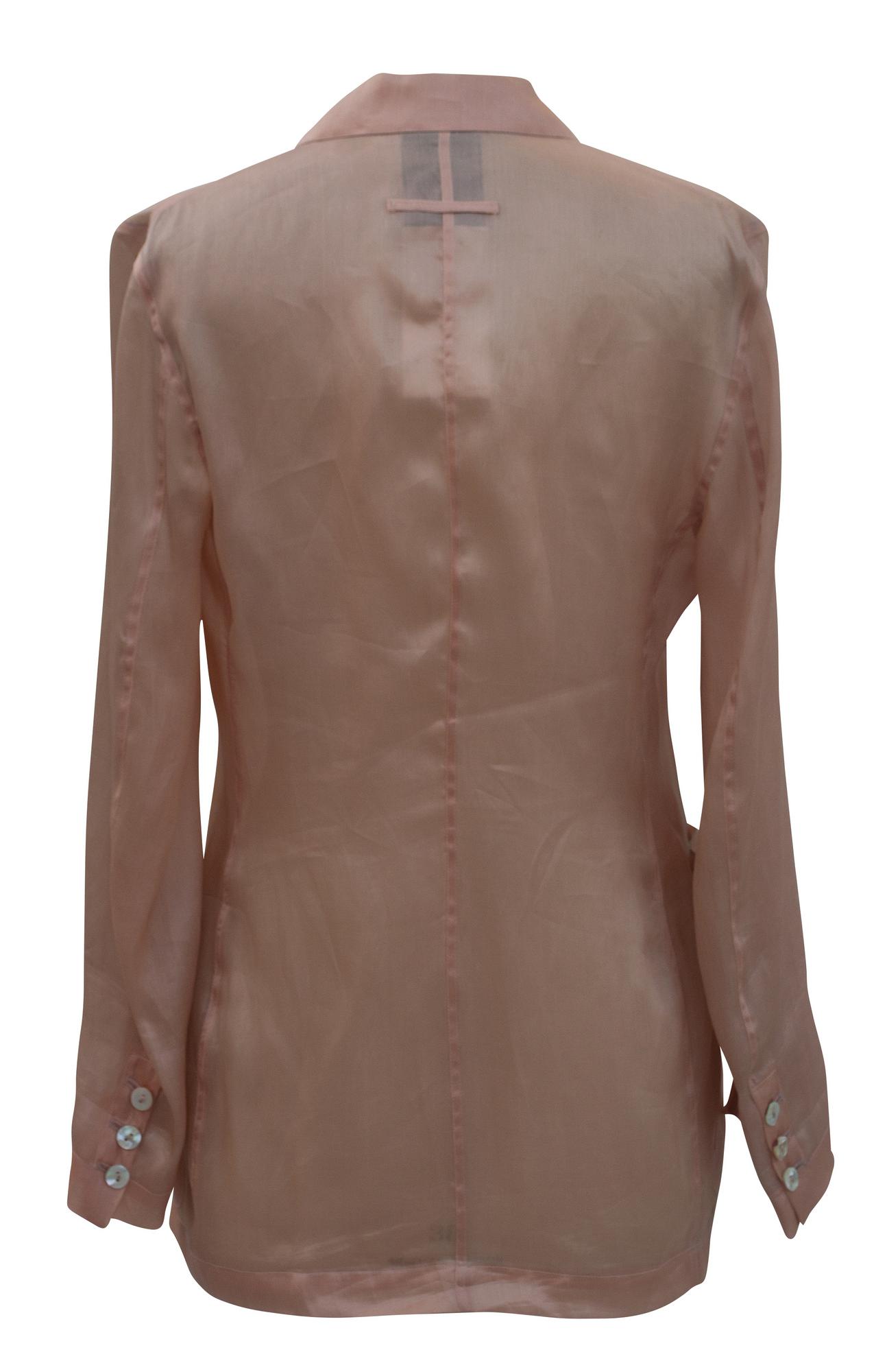 Double-breasted light weight jacket, unlined, made of silk organdy, mother pearl buttons, light pink color. Made in Italy in the '80s. Size IT 42. Well preserved.