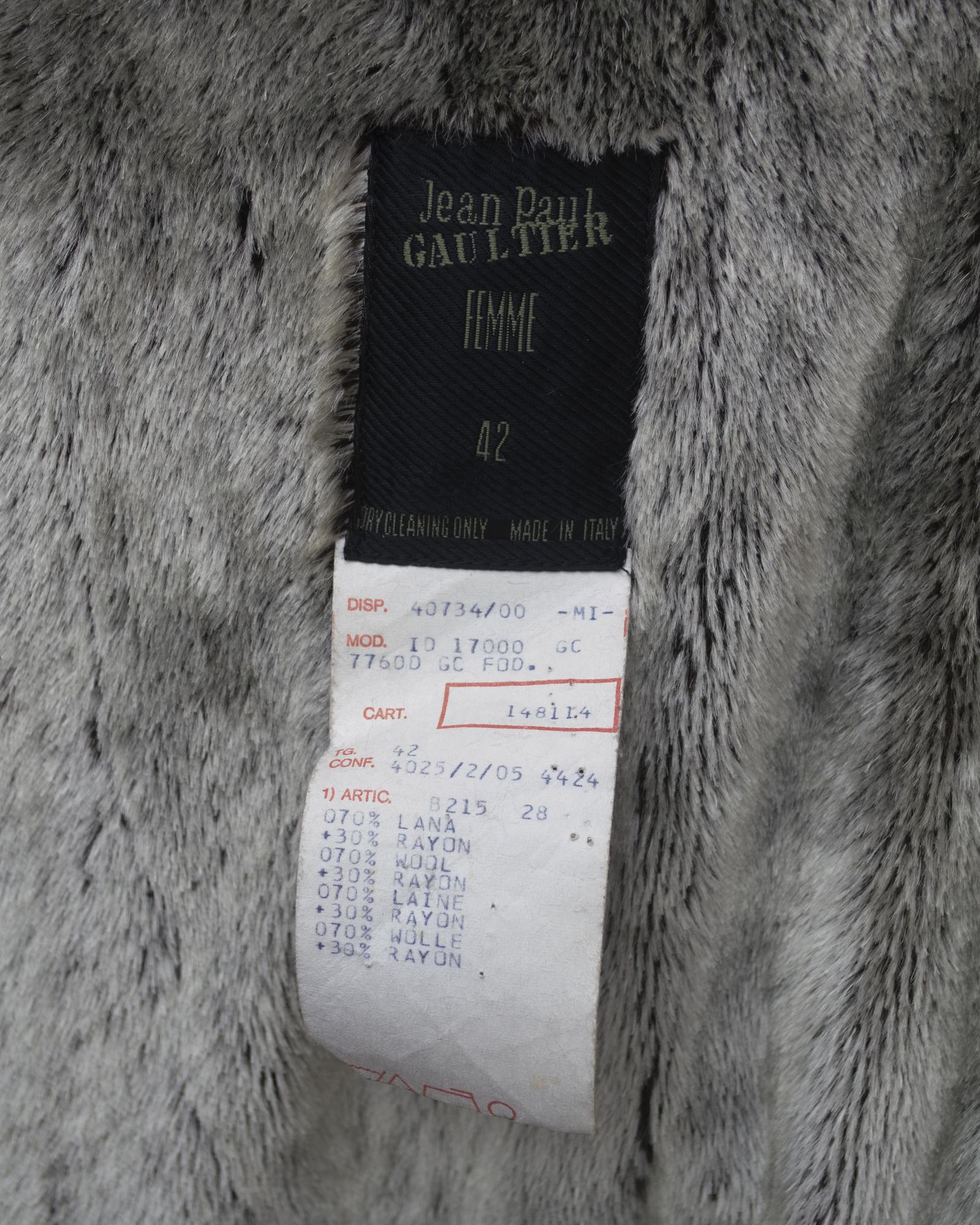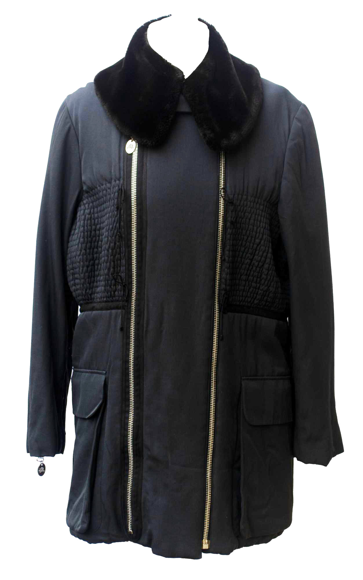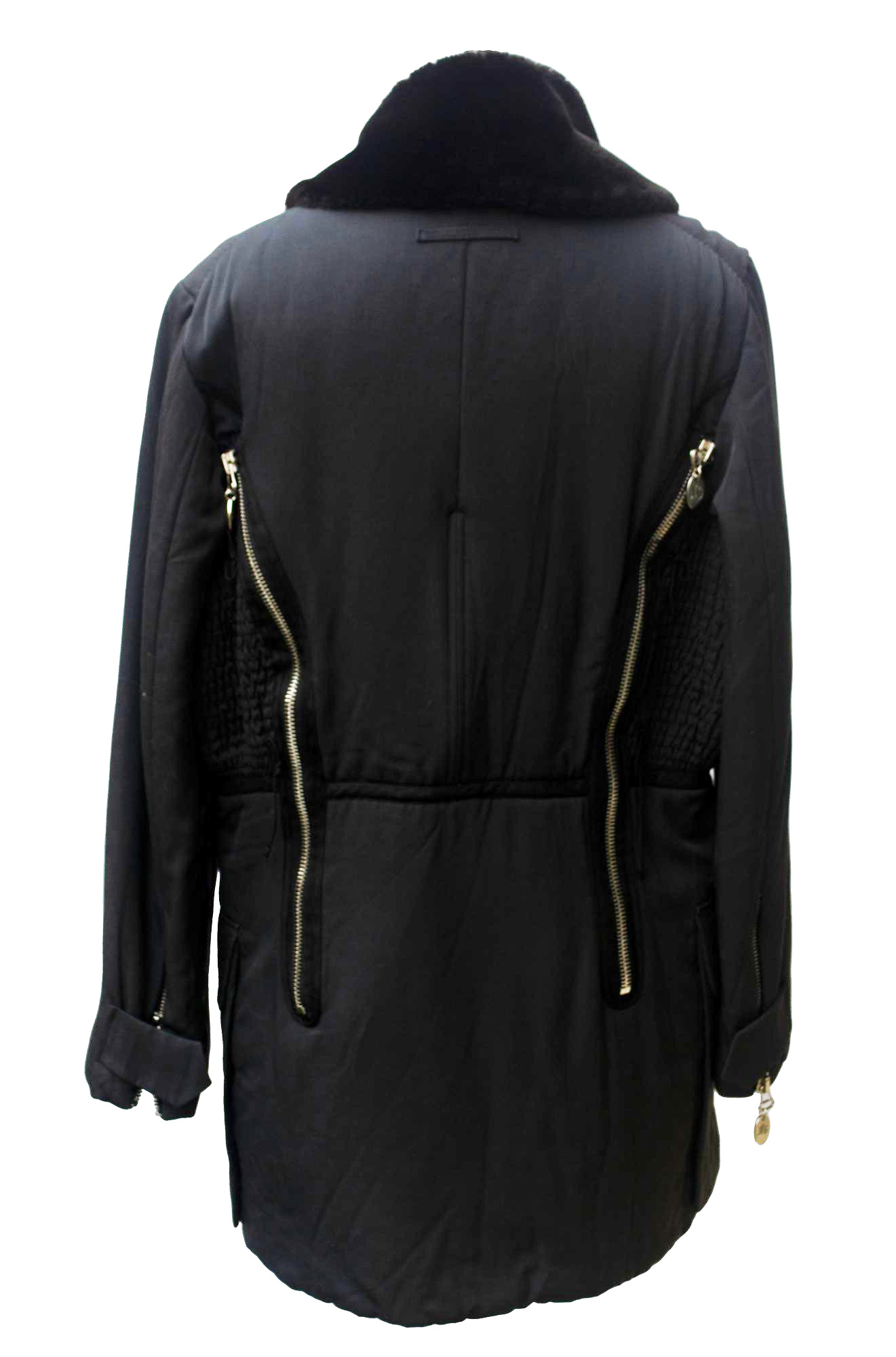 Dark gray wool caban lined in eco fur. Long zips running through the length and in the sleeves are making stronger the look of the caban, big patch pockets with flaps, eco fur collar, embossed effect on both side of the bust. Custom zip pullers. Made in Italy 80s. Size IT 42. Excellent condition.
