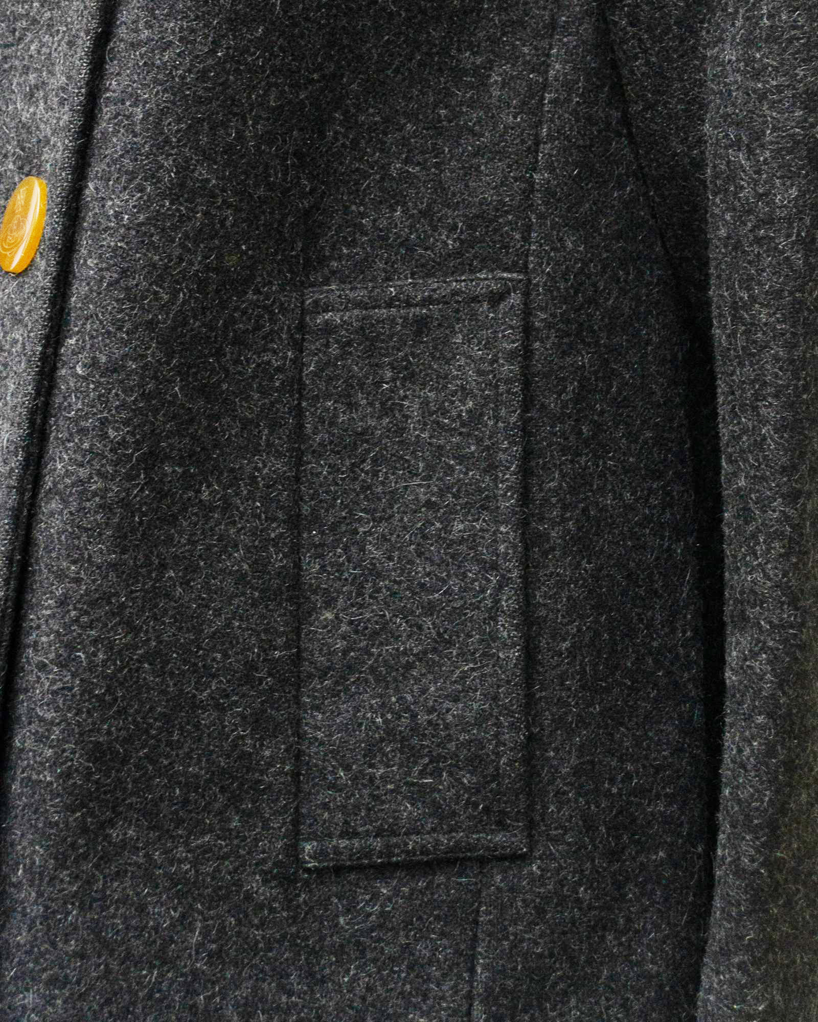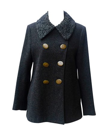 Dark Grey Melton fabric for this double breasted lined caban. Giant Orb Buttons, astrakan pattern for the ecofur collar, side welt pockets. Early '90. Size IT 42. Made in Italy. Perfectly preserved.