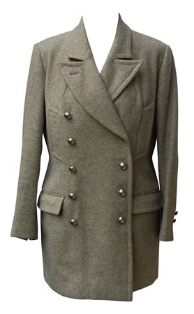 Caban doppiopetto in Harris Tweed grigio chiaro melange, fodera corpo in grigio scuro, fodera maniche in disegno gessato.Tasca laterale a filetto sul busto e tasche con patta sui fianchi. Bottoni in metallo ottone rifiniti in argento. Realizzato negli anni '80. Taglia IT 42. Made in Italy. Perfettamente conservato.