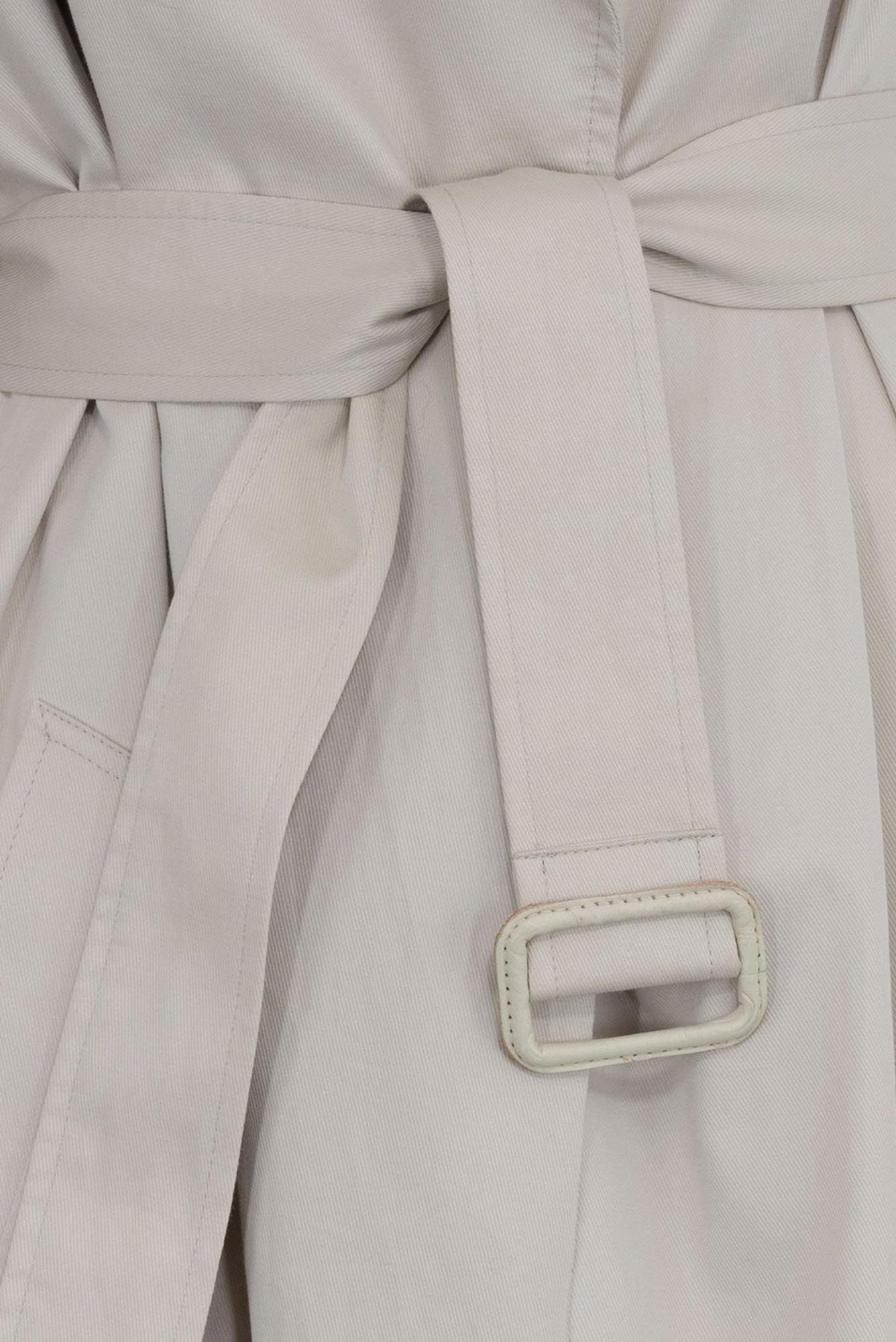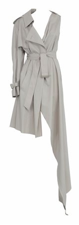 Raro trench asimmetrico, senza bottoni e non rifinito con bordi vivi della collezione PE 06, strascico laterale regolabile, una tasca da un lato e cintura in vita. Taglia IT 44. 100% cotone.