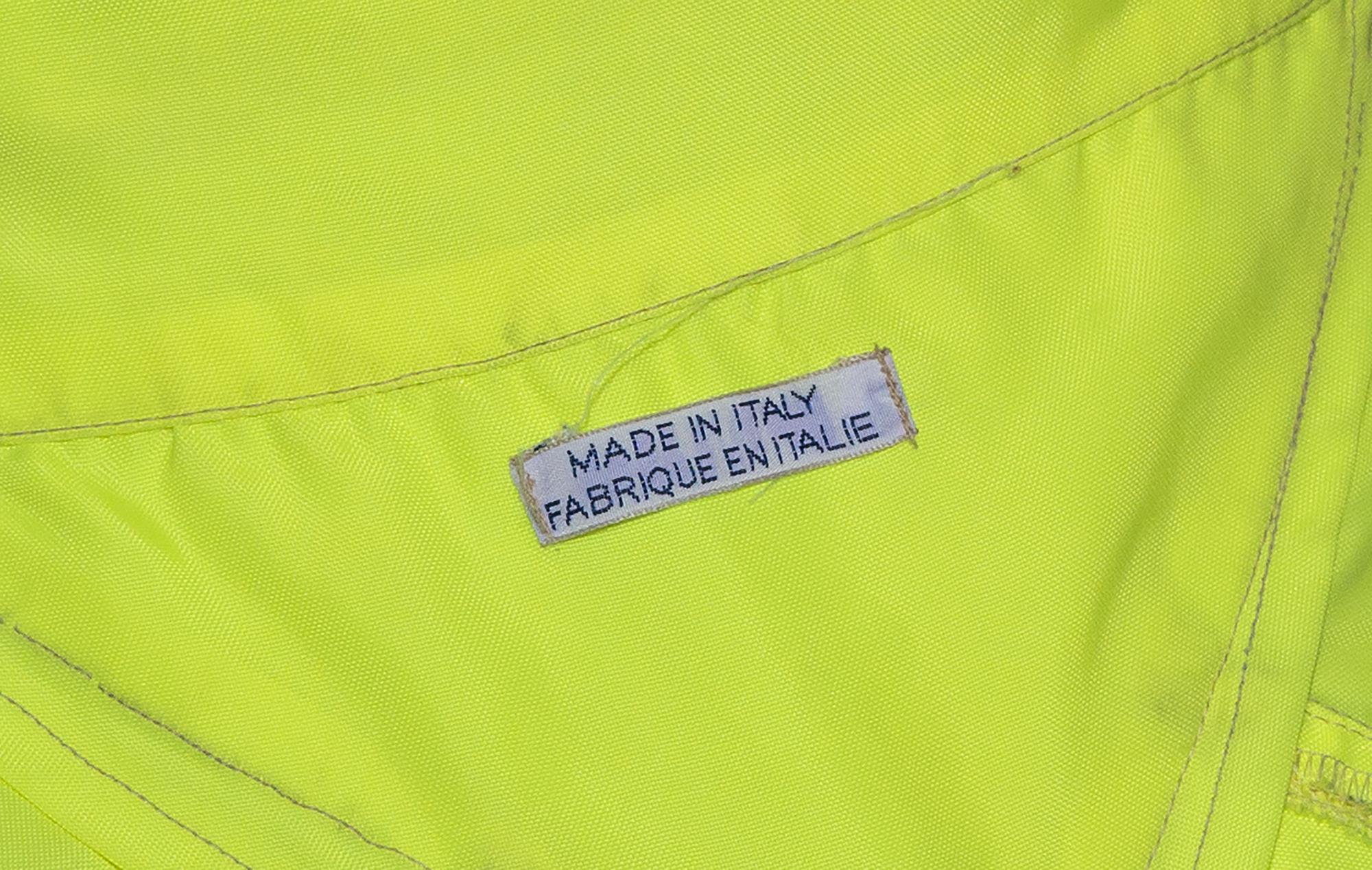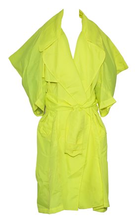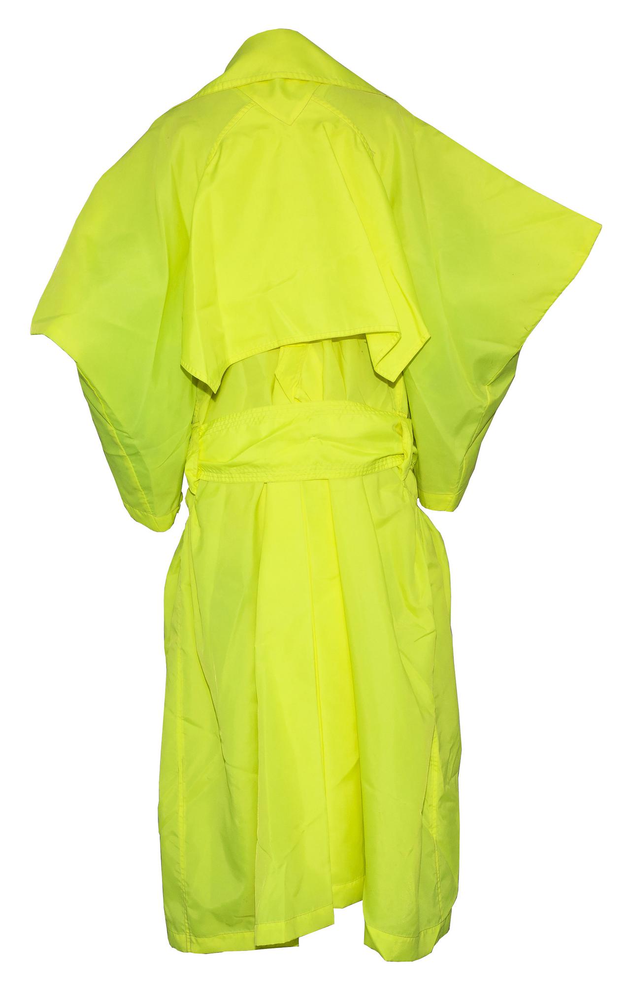 Vintage oversized trench coat in fluo yellow nylon by Vivienne Westwood & Malcolm McLaren Worlds End with lobed lapels, iconic pointed shoulders, pockets and self-tie belt. From 1983-84 'Witches' Collection. SINGLE PIECE in this fabric created for the Paris show. One size. Descreetly preserved.