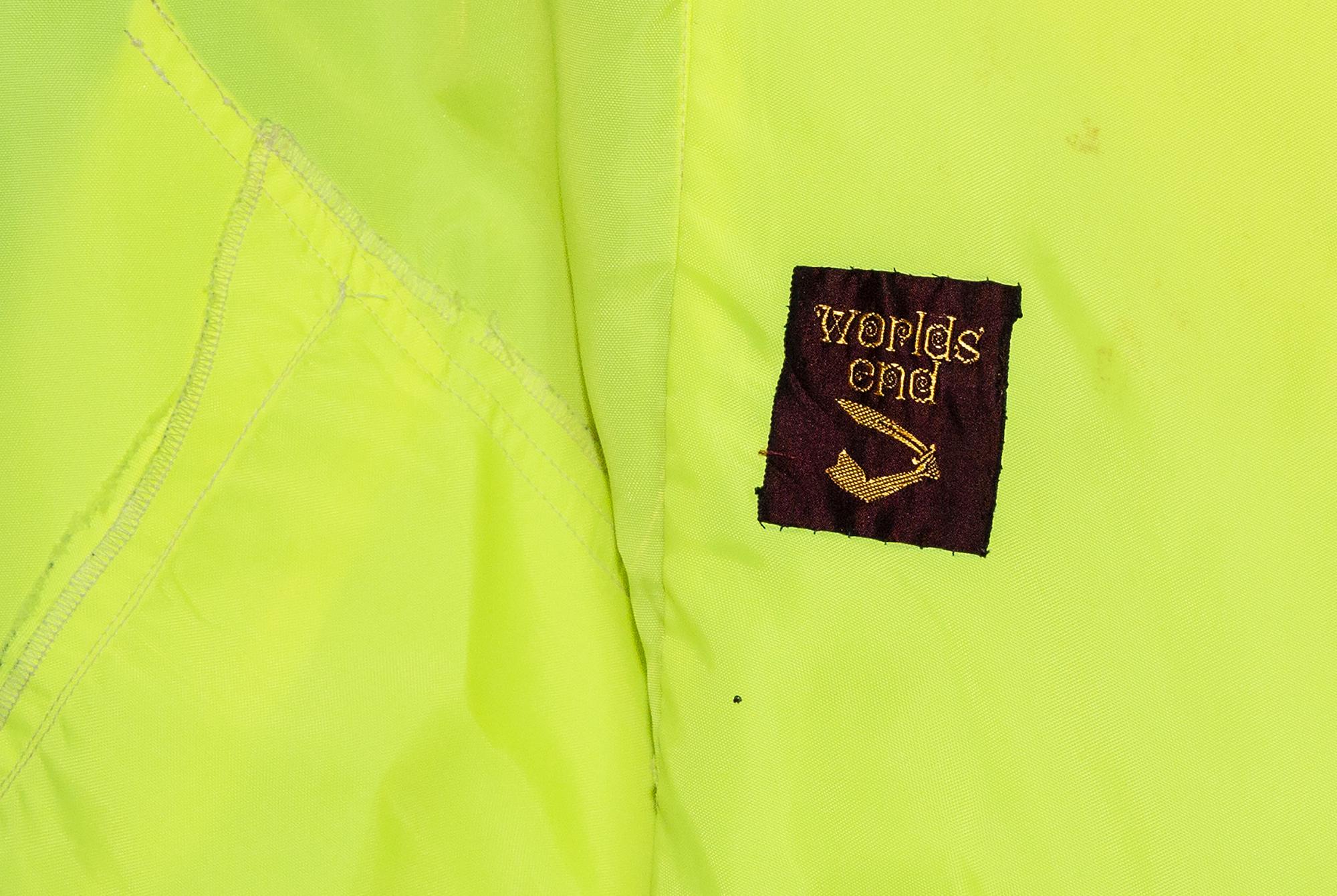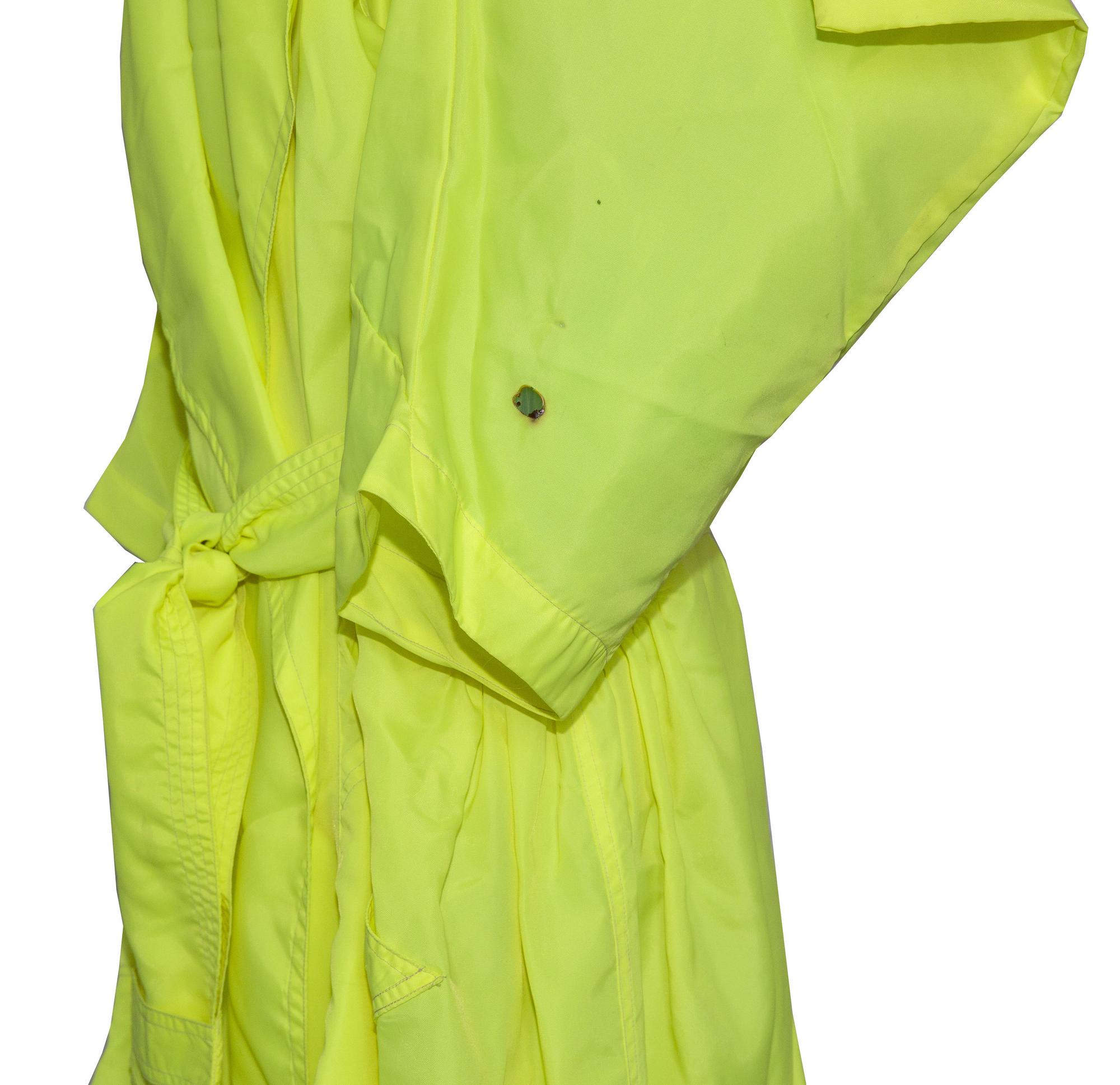 Trench vintage oversize in nylon giallo fluo di Vivienne Westwood & Malcolm McLaren Worlds End con revers lobati, iconiche spalle a punta, tasche e cintura da annodare. Dal 1983-84 Collezione 'Witches'. CAPO UNICO in questo tessuto realizzato per lo show di Parigi. Taglia Unica. Discretamente conservato.