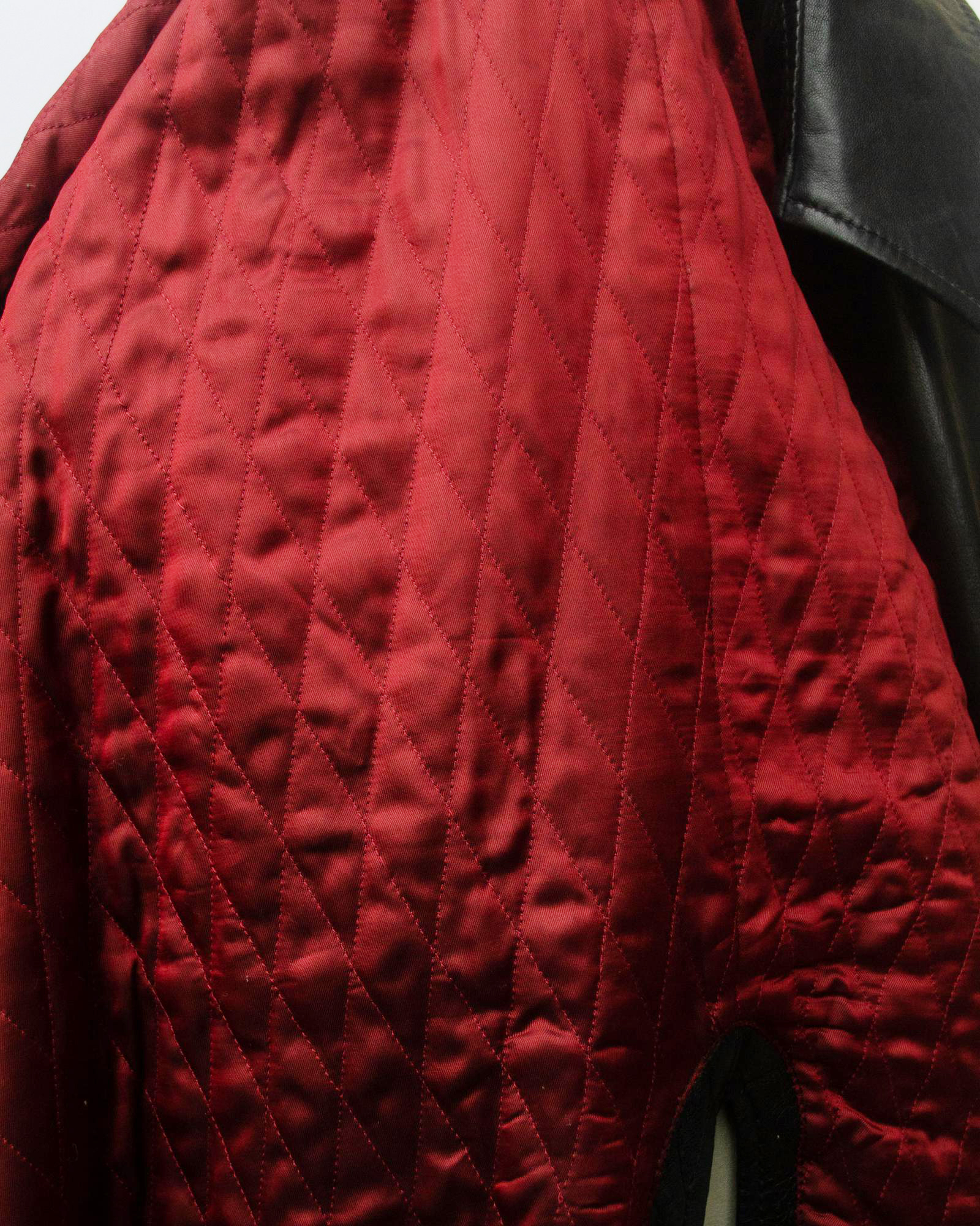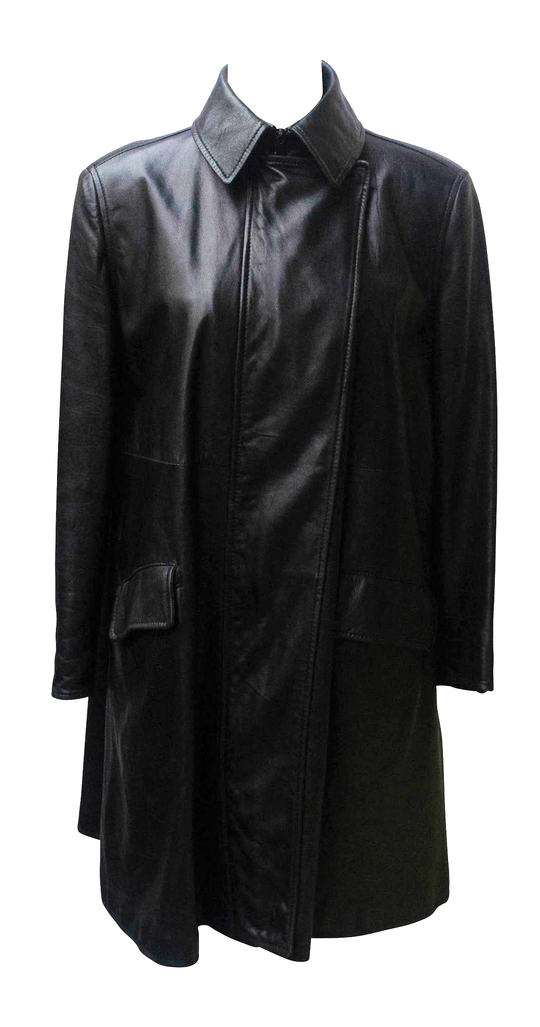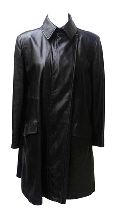 Cappotto in pelle al ginocchio in nero, fodera trapuntata rossa, chiusura con zip centrale davanti sovrapposta, fondo manica con zip. Spalla con spalline, forma leggermente svasata. Tasche con patta. Primi anni '80. Taglia 42. Made in Italy. Perfettamente conservato.