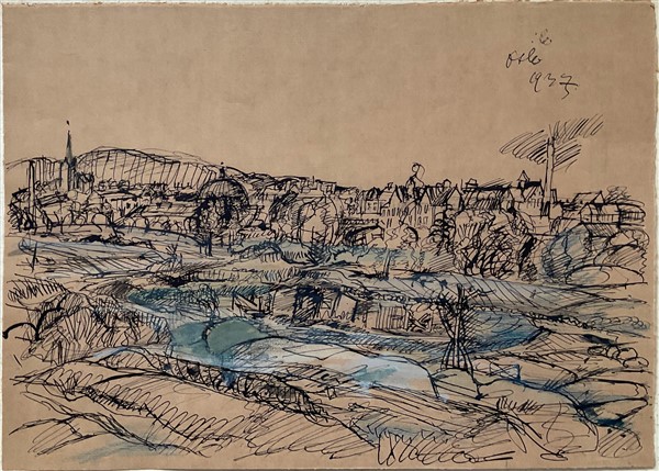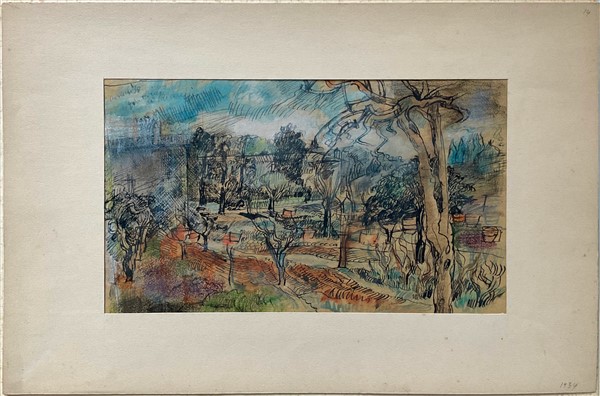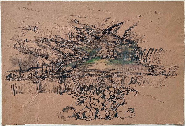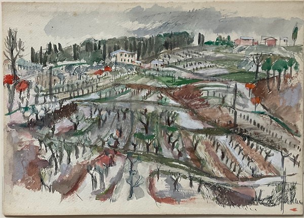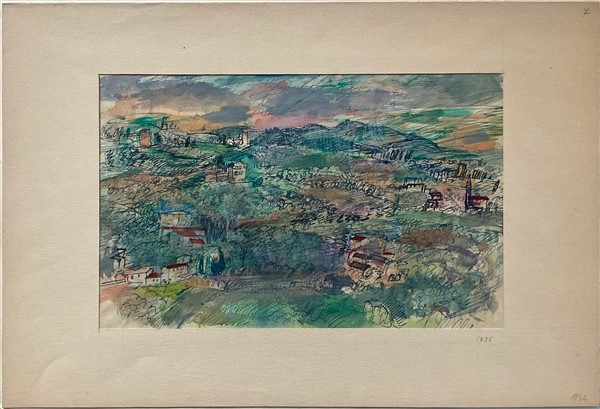 Lotto composto da cinque disegni a tecnica mista su carta raffiguranti paesaggi, mi misure diverse
