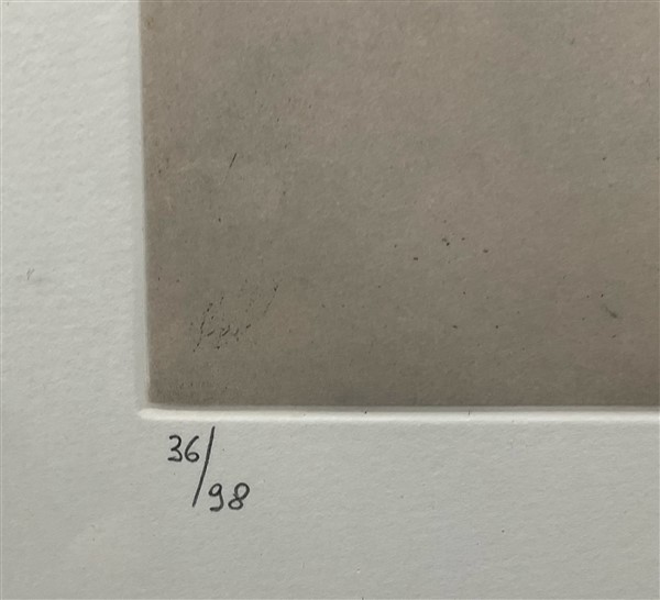 firmata e numerata 36/98 in basso a matita, timbri a secco Vigna Antoniniana Stamperia d'Arte, Roma in basso a sinistra. In cornice