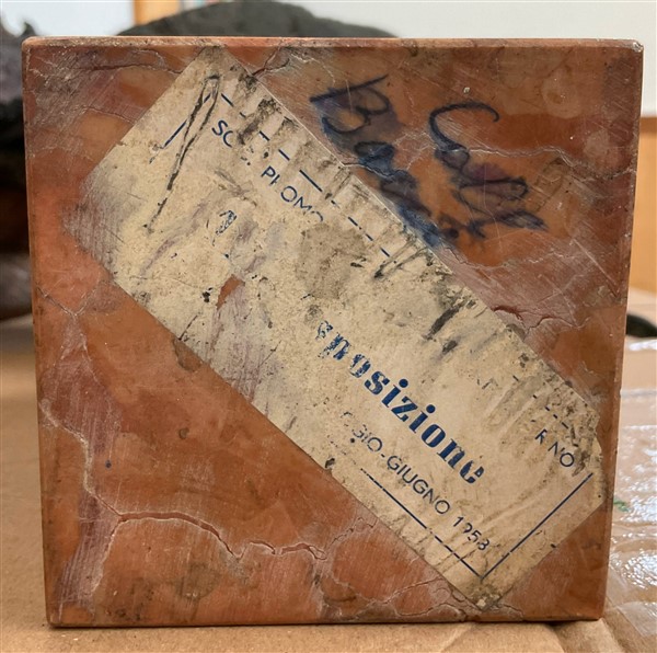 tracce di etichetta espositiva alla base (difetti al basamento)